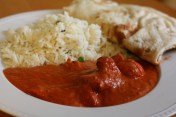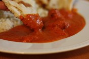 Chicken Tikka Masala is sort of a funny dish. Basically, it’s composed of chunks of marinated chicken in a creamy, spiced tomato sauce. Sounds simple enough, but run a search for recipes and you’ll find a long list of completely different recipes, using different ingredients, different spices, and different cooking techniques. One recipe will call for yogurt, the next calls for cream, still another calls for coconut milk. The source of spiciness varies too, some recipes using chopped jalapeno while others use ground red chile or cayenne. Some recipes include peppers and onions. Some even incorporate ground almonds or cashews into the sauce. I’ve tried making it a few times, experimenting with recipes I found online and also concocting my own versions, but I haven’t gotten it quite right yet. It’s been good, but not what I’m looking for. I’ve considered calling up the Indian restaurant that we frequent and begging for their recipe. My kitchen-avoiding husband (who once put a frozen pizza in the oven on its cardboard packaging) even tried his hand at making naan. Now, that’s commitment!