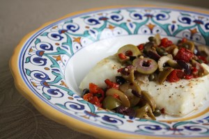 So, it’s not unusual that I woke up this morning with no idea about what I’d make for dinner. After a weekend of indulging on celebratory pizzas, birthday cake, and our standard Sunday night chicken tikka masala with naan, I knew I wanted something light and fresh. (It’s all about balance!) I also knew I wanted something fast and easy; low-prep, quick to cook, minimal clean-up. As much as I enjoy cooking, I don’t like to be cooped up in the kitchen on a beautiful spring day! There are bikes to be ridden and playgrounds to visit! So, I started thinking about a quick broiled fish, perhaps with lemon and capers. Capers made me think of olives, which, in turn, got me thinking of sun-dried tomatoes. And that, dear friends, is the train of thought which led to tonight’s dinner plan. It’s light, loaded with nutrition, and can be thrown together in about 15 minutes. Best of all, it’s full of Mediterranean inspired flavor.