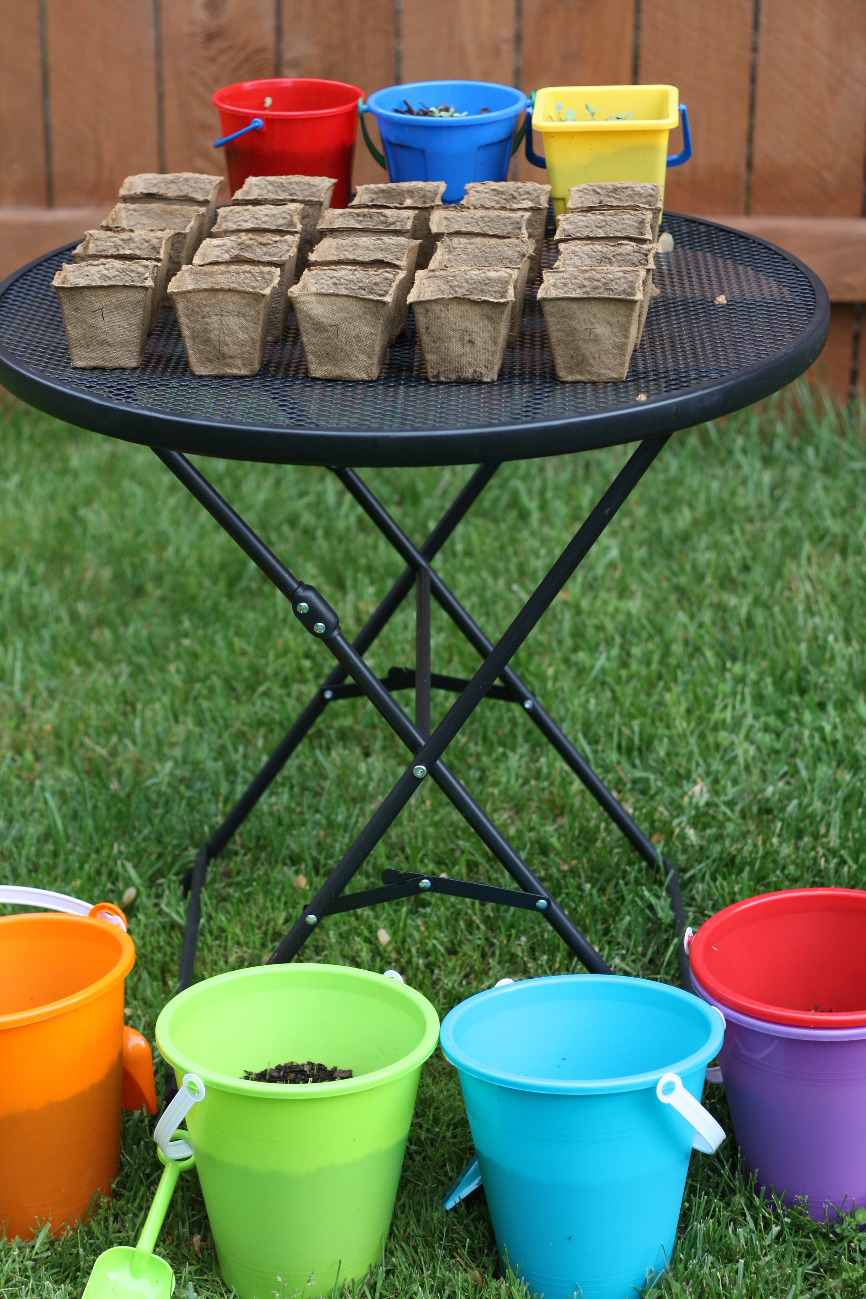 Well, I’m trying to, anyway. I’m not much for growing things. But, I love the idea of it. What could be better than fresh veggies from my backyard? Free of pesticides, full of fresh garden flavor… So, a couple weeks ago, I picked up a few packets of seed, some organic potting mix, and some planting pots. Then, the boys and I went about our way, filling pots (and a few sand buckets), and burying seeds. I’m still not sure we did it right. Our procedure was a little haphazard. There are definitely too many seeds in each pot. I’m not even certain what we planted or which pots we planted it in. (Though, I’m pretty sure I planted the green onions in the green sand bucket.) We may end up with some sort of bizarre half-carrot, half-beet mutant. It’ll be fluorescent orange. I’ll call it a beerot and serve it roasted with goat cheese. The local newspaper will come to take pictures of my gardening anomaly and I’ll win a prize at the state fair!! Or, maybe we’ll just end up with some regular vegetables, which would be pretty cool too.