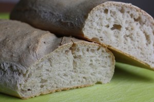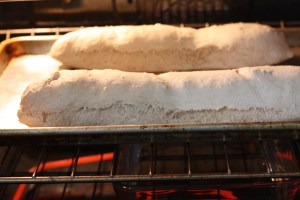 After an hour had passed, I formed my sticky dough into long loaves, waited the specified 20 minutes, and popped them in the oven.