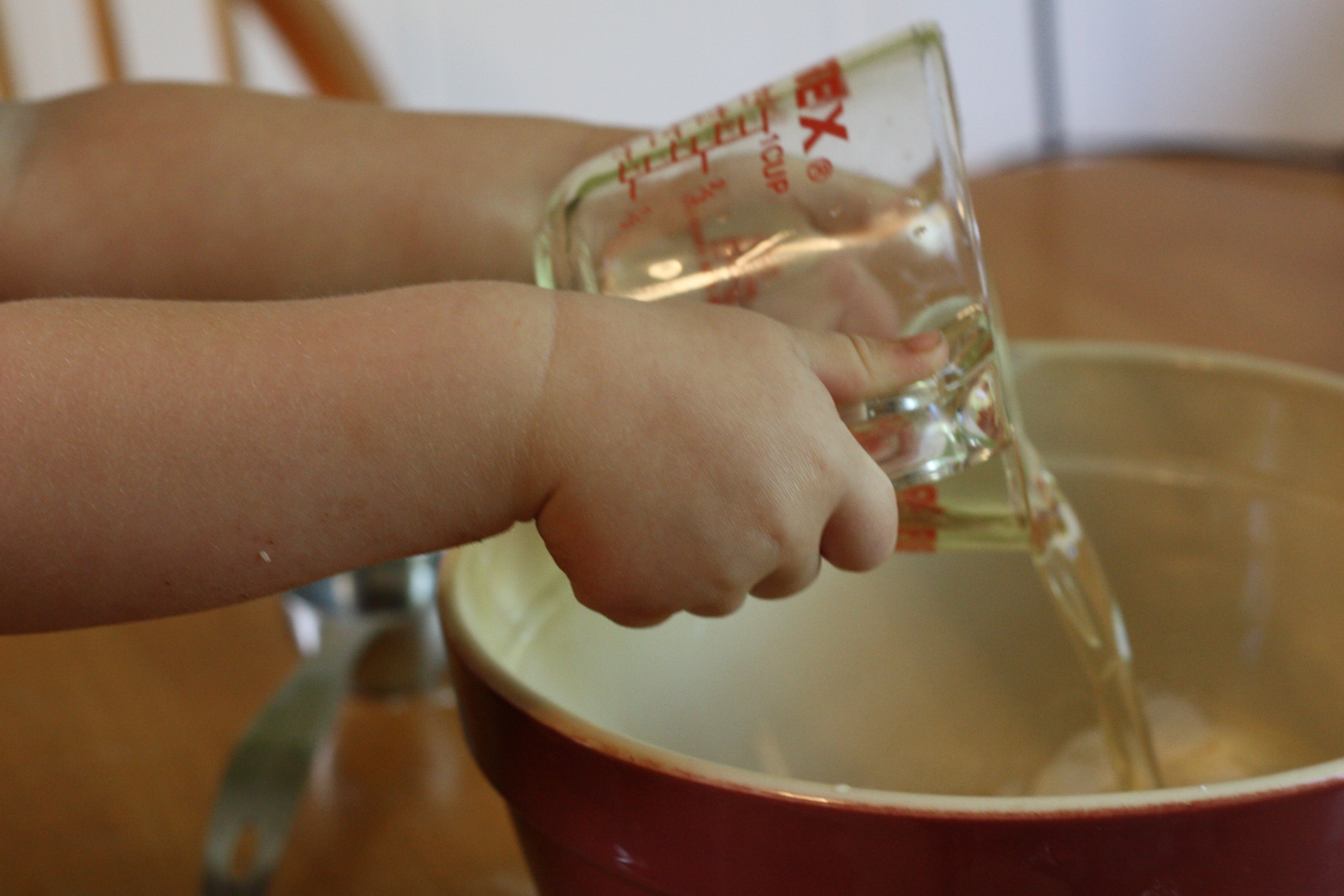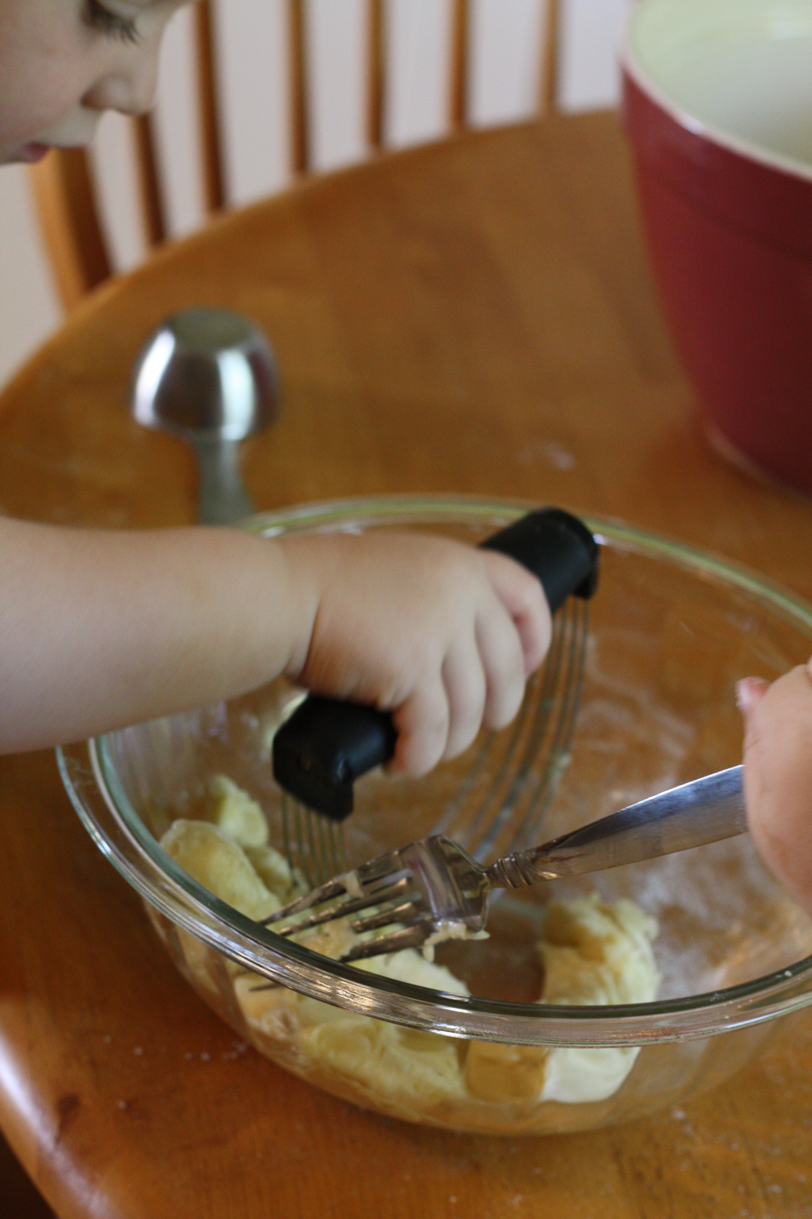 - Select tasks which are age-appropriate for your child. (Kids are expert mixers, pourers, and banana-mashers!) Give them tasks to keep them occupied between steps.