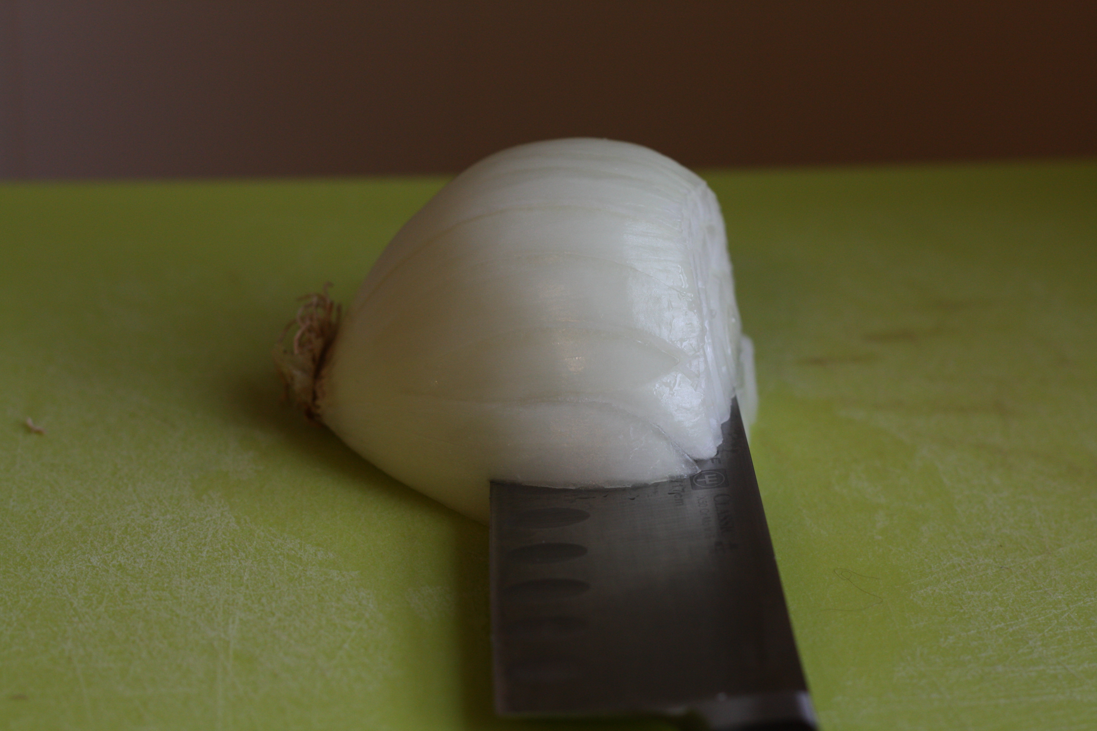 Using your fingers to hold the sides of the onion together, carefully make one or two horizontal slits into the onion, being careful not to cut through the root.