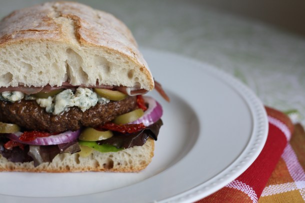 Beef Patty on Ciabatta with Gorgonzola, Prosciutto, Sun-dried Tomatoes, Olives, and a Roasted Garlic Aioli