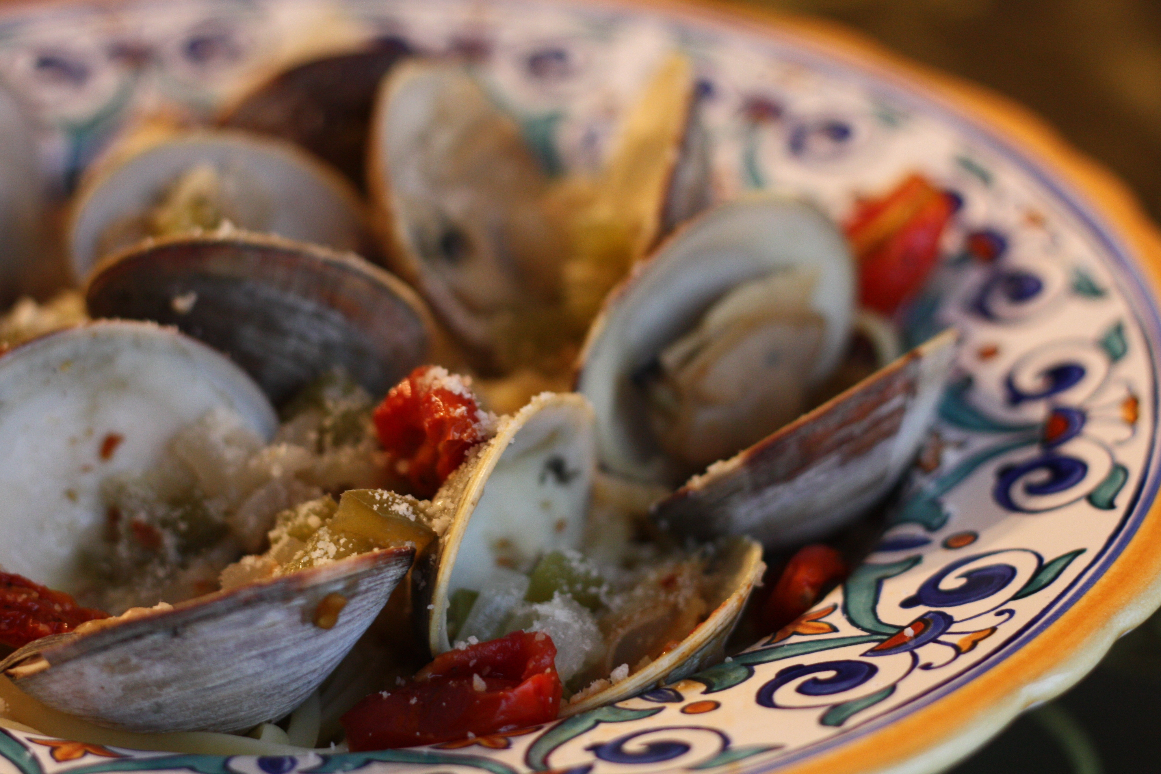 Tonight, I’m serving up a minor variation on my regular Linguine and Clam Sauce.  The basic ingredients are the same; garlic, onion, pepper, white wine and clams. But, today I’m using fresh clams (where I often use canned, chopped clams). I’m also incorporating a little anchovy for added flavor and garnishing with slow-roasted grape tomatoes. If anchovies are a deal-breaker for you, skip them. I’ve made this recipe tons of times without them, but they really do add a nice touch to the dish. They dissolve into the sauce and add a really nice savory flavor. If you decide to omit the anchovies, be sure to season your sauce with a bit of salt.