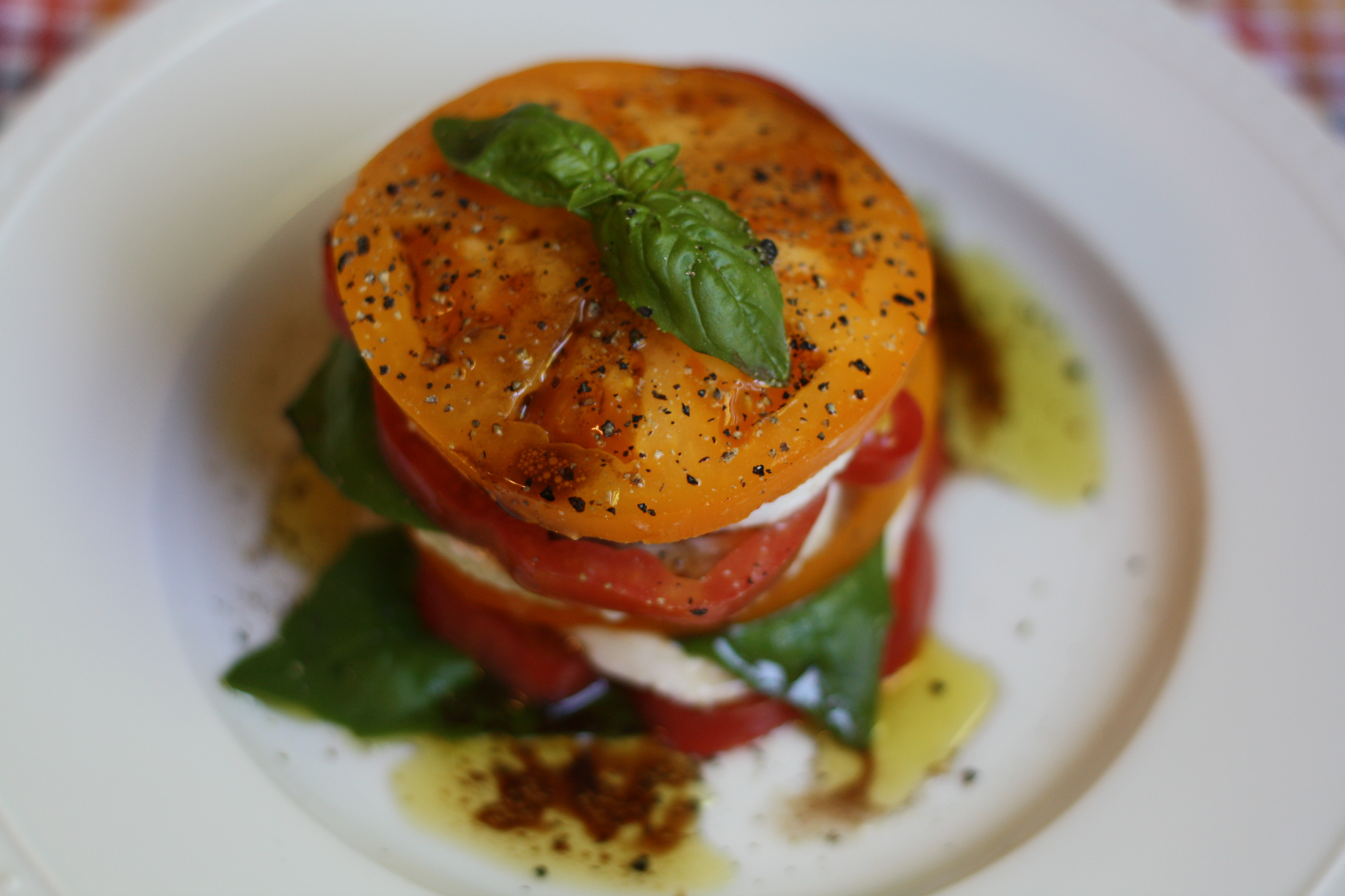 There’s no big secret of a recipe here! Slice up some ripe tomatoes and a bit of fresh mozzarella. Add a few basil leaves and drizzle with balsamic vinaigrette. Check out my basic balsamic vinaigrette recipe here.
