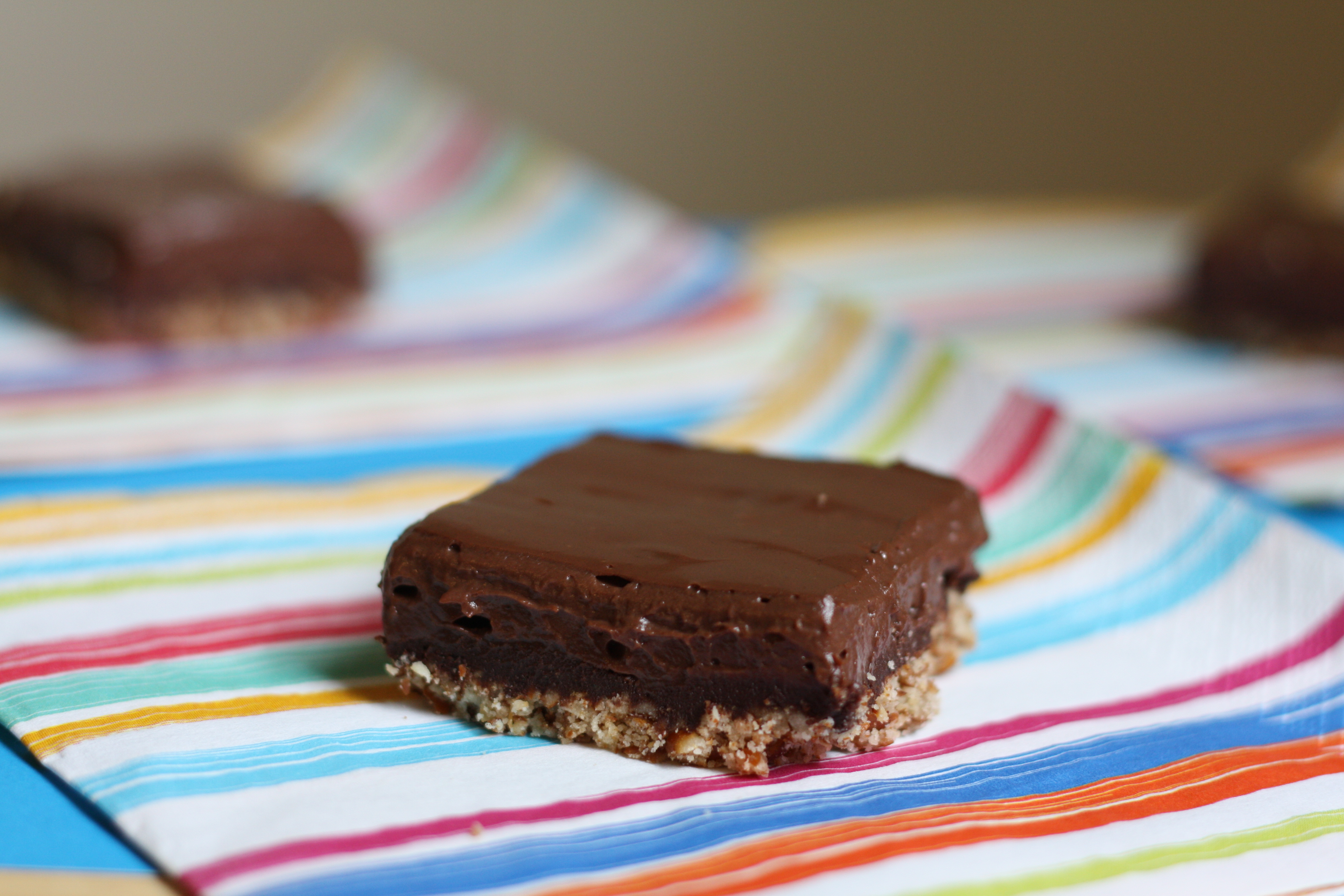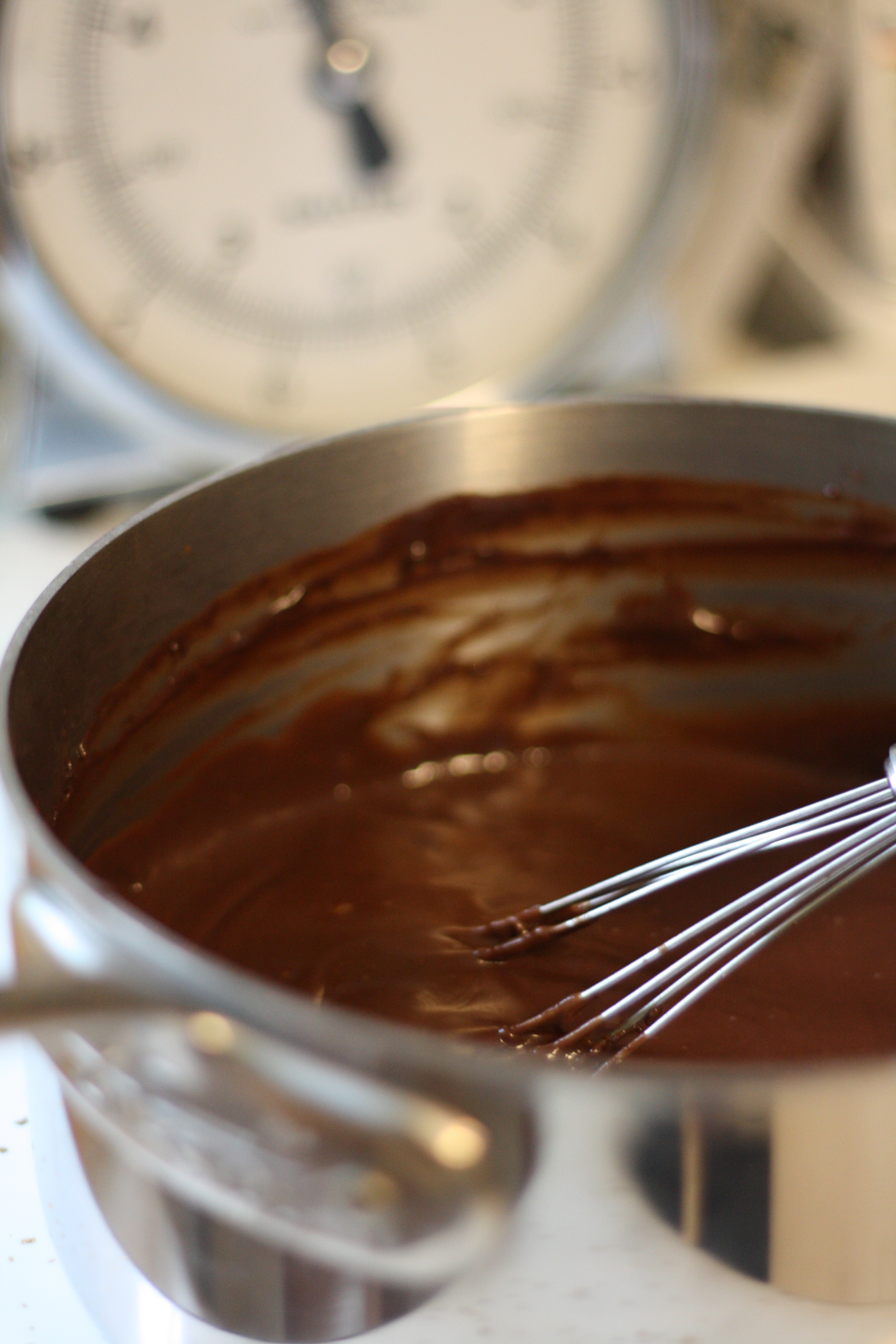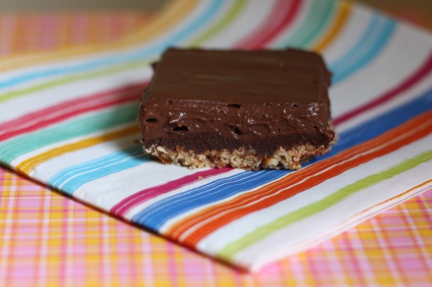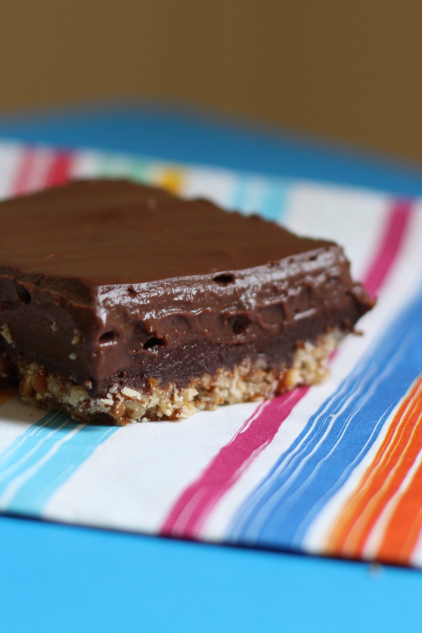 Remember earlier in the week, when I drenched 4 cups of fresh-picked strawberries in jello? Remember how sorry I was? Poor little strawberries, still helplessly preserved in a gelatin coating in my fridge. Anyway, that Strawberry Pretzel Square recipe, may well reap an even tastier reward. As I was eating one of those bars, and ruminating about the genius pretzel crust, it occurred to me that the one thing which would make the pretzel crust even tastier was, of course, chocolate! And then the idea started to take shape. Yes! I’d make a pretzel crust. Then, I’d skip the Cool Whip and top it with a layer of chocolate ganache instead. You picking up what I’m putting down? In place of jello, I’d make a homemade dark chocolate pudding. Oh, yes!! That’s the ticket! Cut it into little squares and you’ve got Chocolate-Covered Pretzel Squares! I’m sure you can understand why I couldn’t wait until next week.