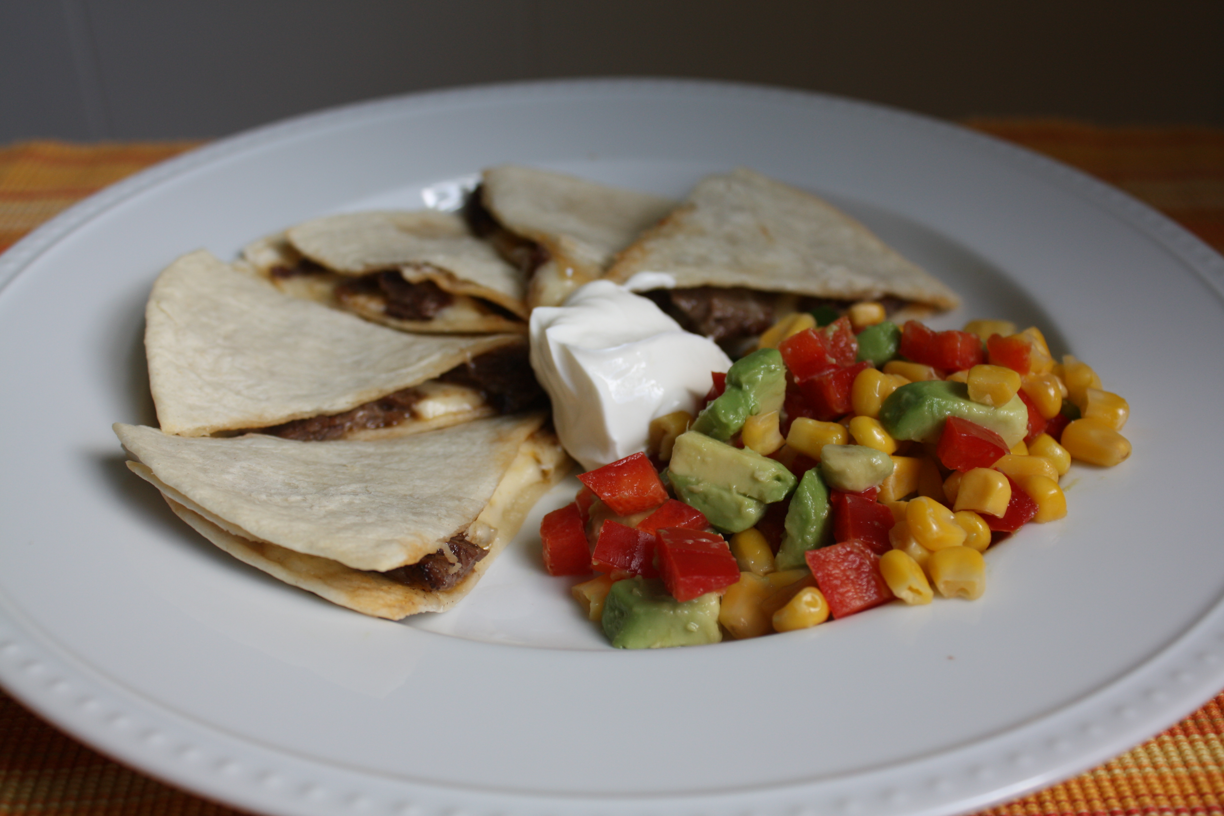 This is a super simple, yet incredibly satisfying meal! It requires very little in terms of ingredients and cooks fast. In the quesadillas, we’re using juicy skirt steak, seasoned with chipotle pepper, and held together with melty pepperjack cheese. Skirt steak is generally known for being one of the toughest cuts of steak, but I’ve honestly never encountered a tough skirt steak. When cooked quickly at high heat and cut against the grain, they are incredibly flavorful and practically fall apart. Good substitutes for skirt steak would be flank or hanger steak. On the side, we’re having a salad of sweet corn, avocado, red bell pepper and a bit of jalapeno pepper. This bright, refreshing salad is a cool balance to the heat of the quesadillas.