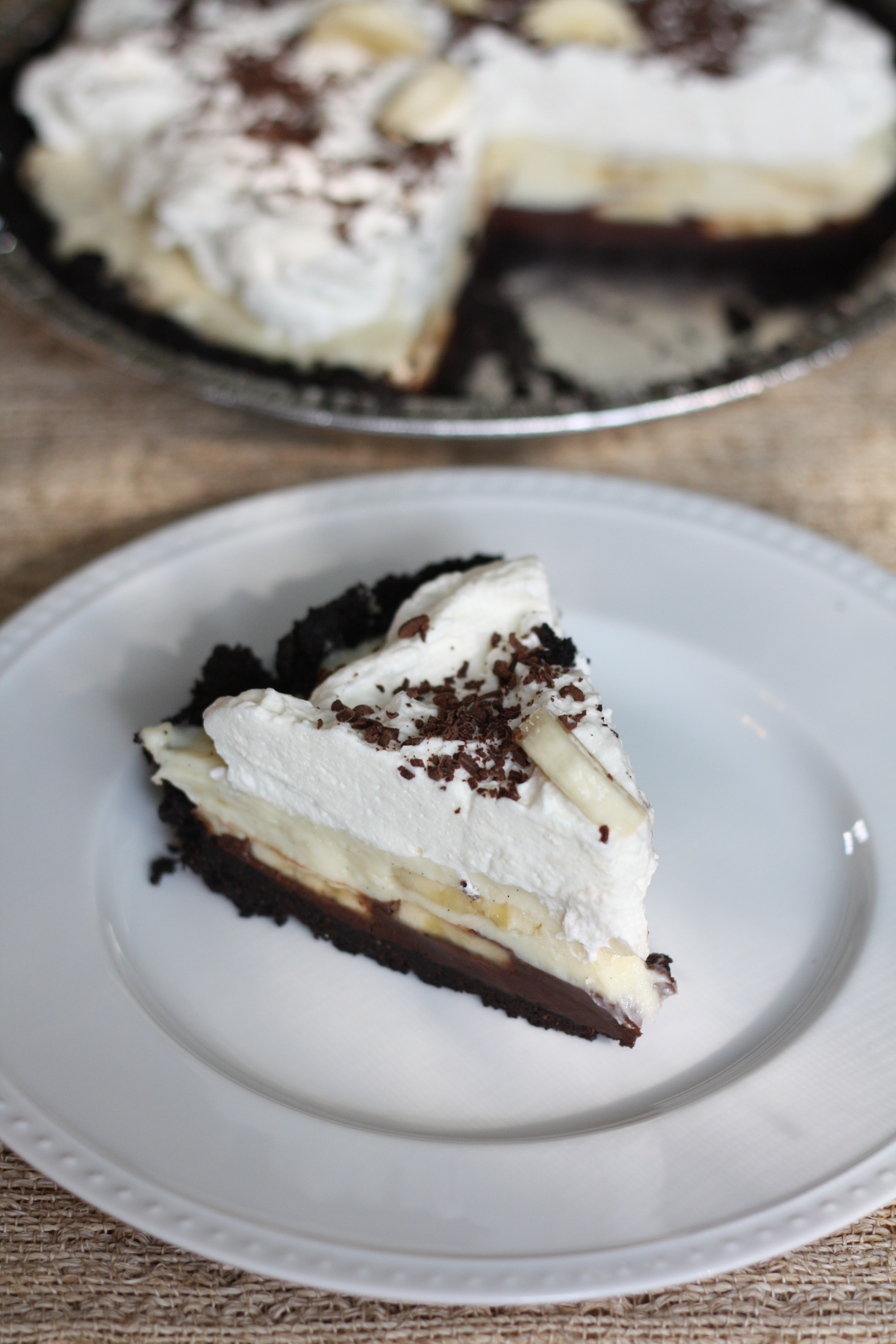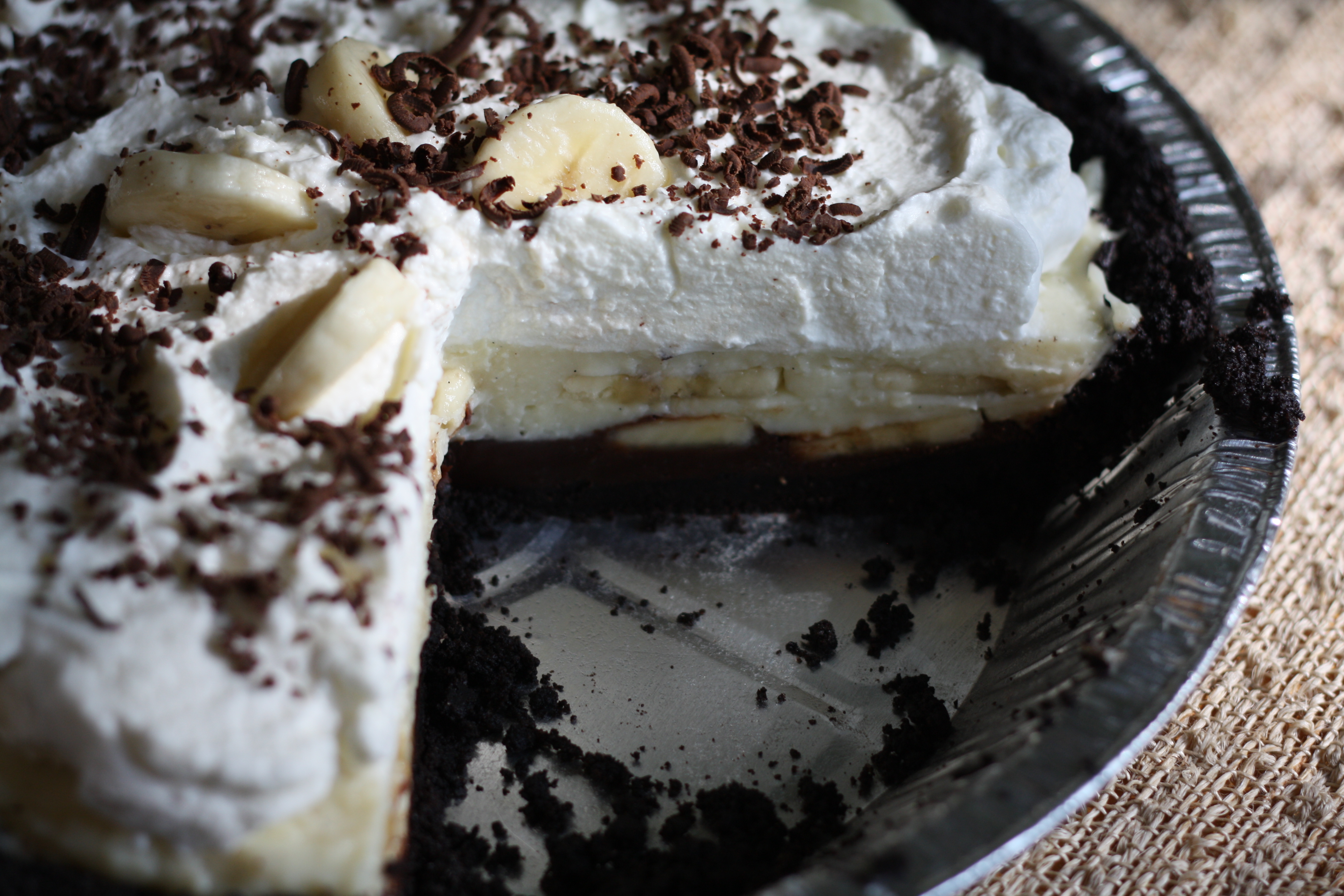 During one of our visits to Lady Jane’s I had the most luscious dessert and every so often, I get the itch to recreate it. So, in celebration of my sweet baby boy’s health, we’re having Black Bottom Banana Cream Pie tonight. It’s the perfect combination of chocolatey crust and rich ganache, layered with fresh bananas and vanilla custard. A mound of fresh whipped cream and a sprinkle of chocolate shavings complete the decadent pie.