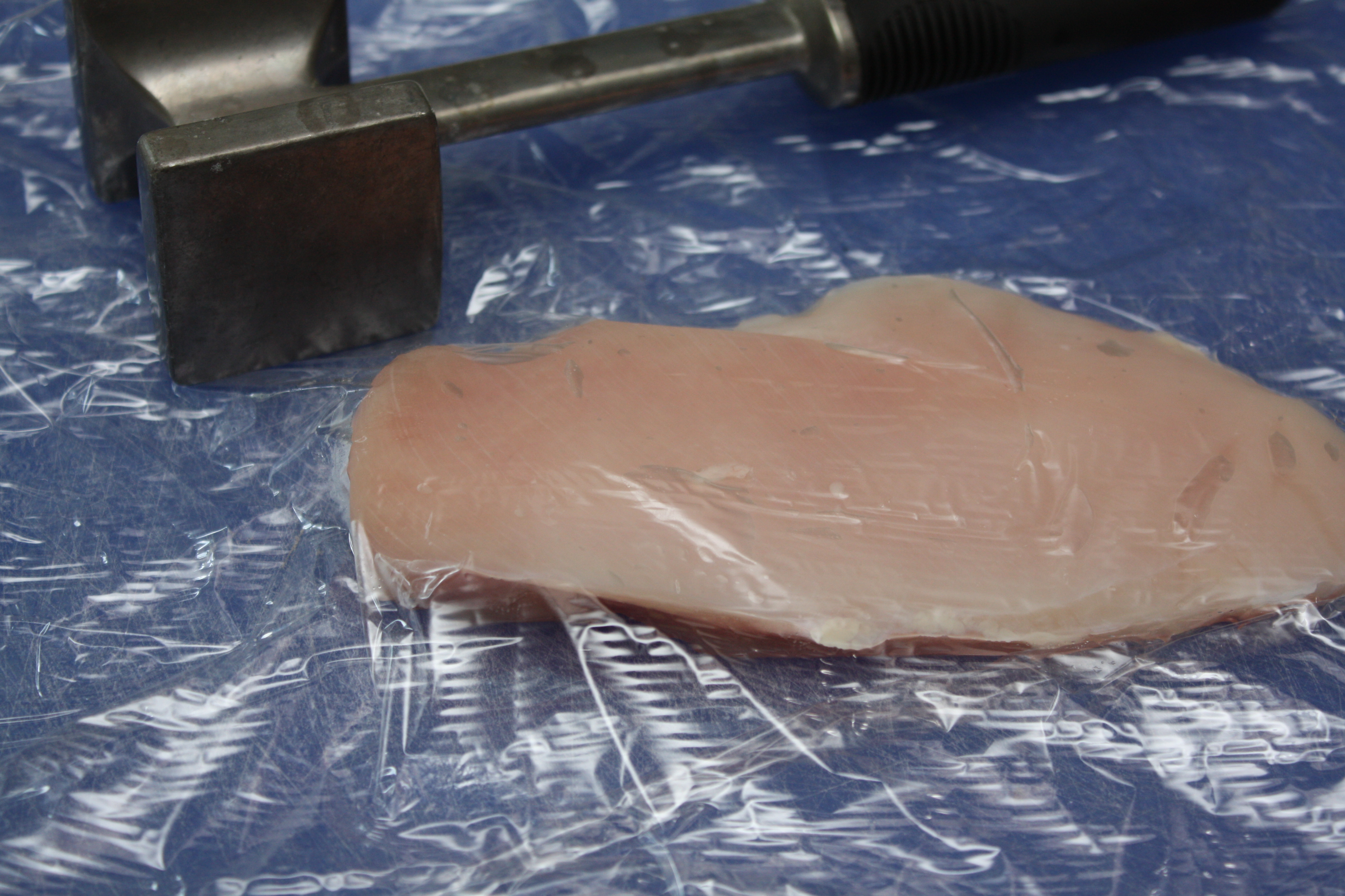Preheat oven to 375 degrees. Pound the chicken breast between plastic wrap until about 1/4 inch thick.