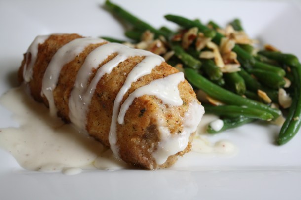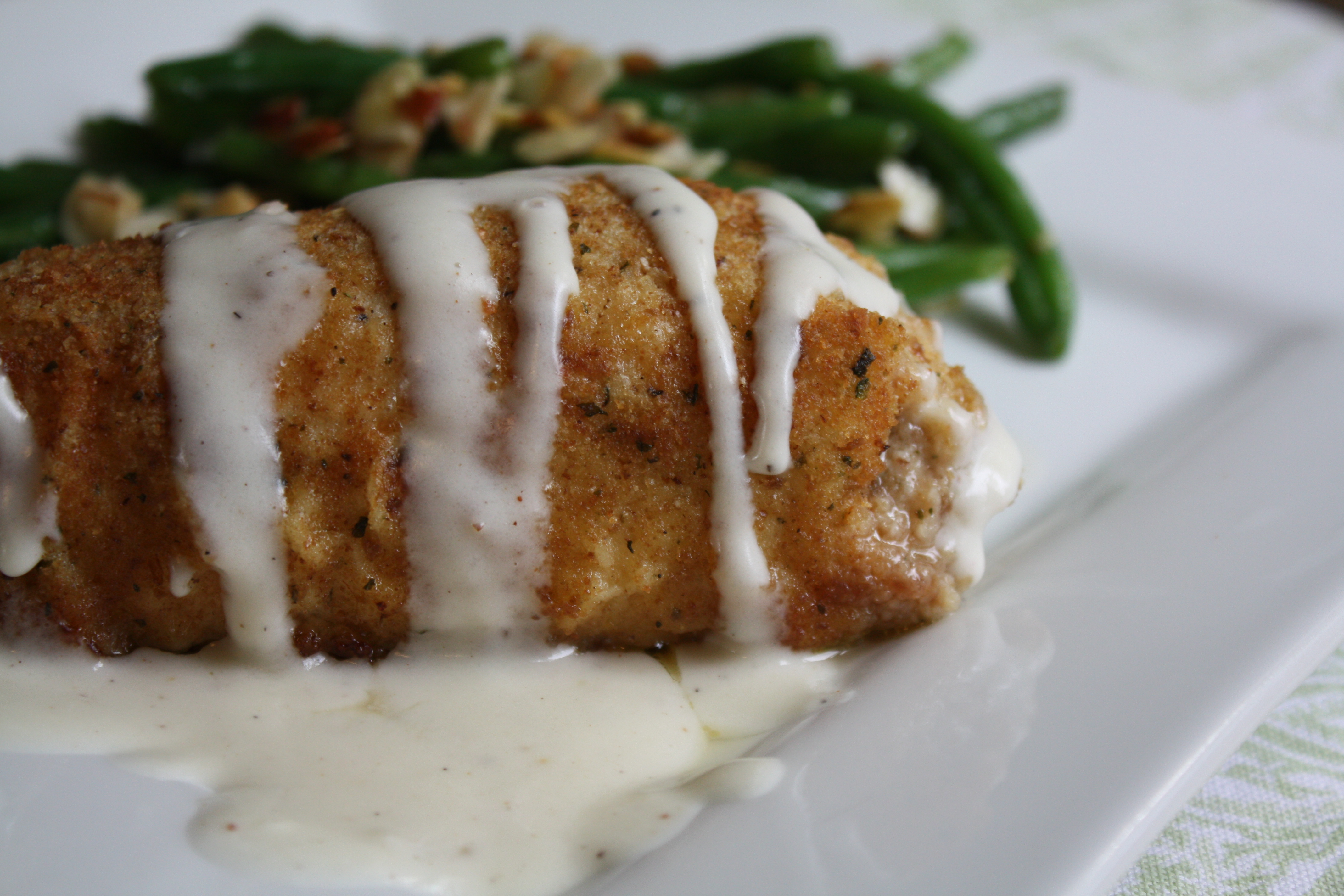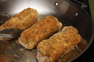 Chicken Cordon Bleu can be made a number of different ways. The most common procedure involves stuffing or rolling a chicken breast with ham or prosciutto and some type of swiss cheese, then breading and cooking. That approach will work, but I’ve had issues with the cheese oozing out during cooking. I hate to lose even a bit of cheese. So, I’ve come up with a different way of making chicken cordon bleu. I roll prosciutto in chicken breast, bread it, brown it in olive oil until golden brown, and finish the cooking in the oven. While the chicken is baking, I make a basic white sauce, or bechamel sauce, and then melt in some tasty Gruyere swiss cheese. No cheese is lost in the cooking and you get a nice creamy sauce to drizzle over the chicken. And who doesn’t like having a sauce to dip in??