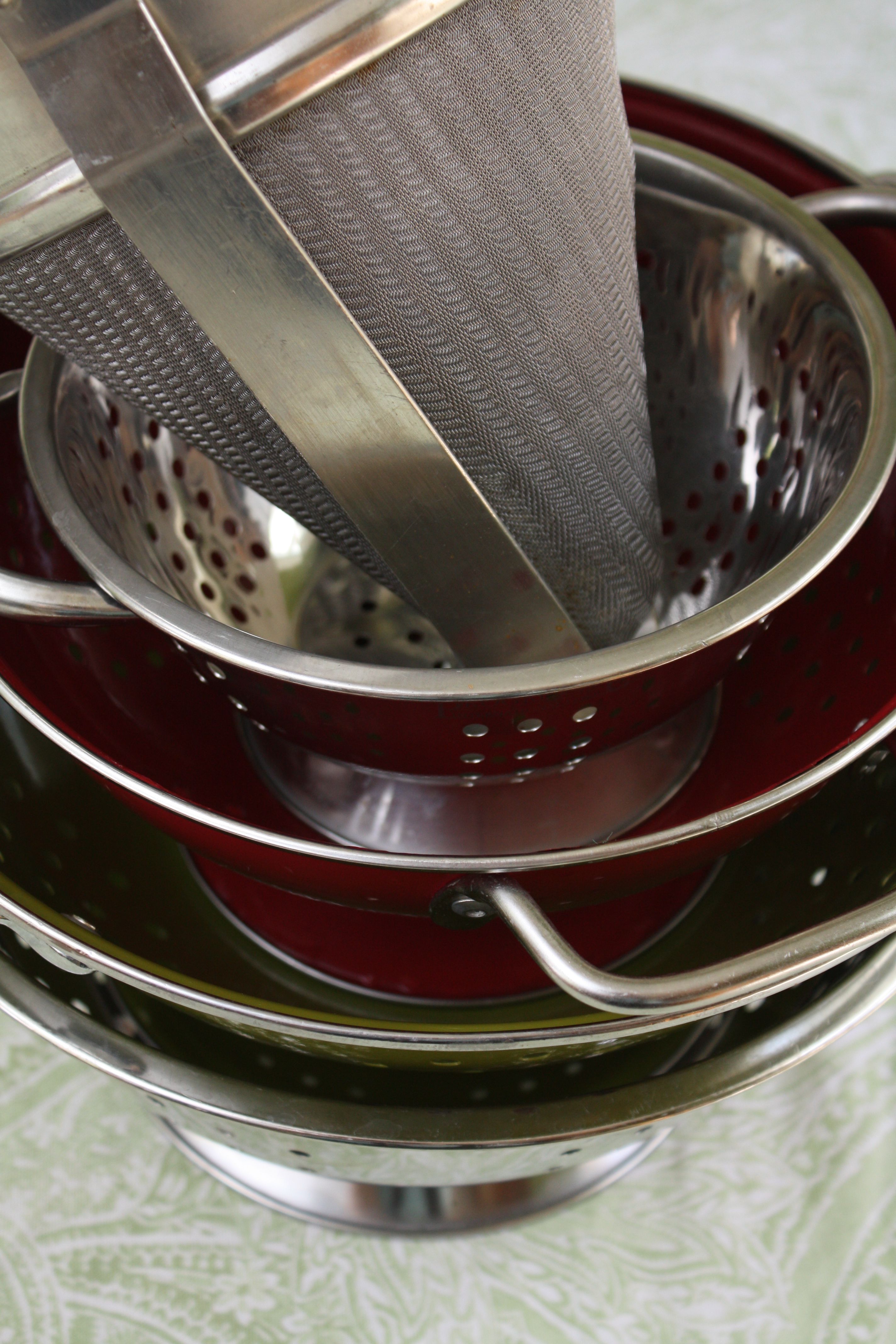 I love pretty enameled colanders, though admittedly the stainless steel ones are more durable. There’s really no reason for anyone to have as many colanders as I do, but I love them. The conical shaped strainer is called a chinois (pronounced shin-WAH). It’s a very fine mesh strainer, great for straining sauces or stocks.