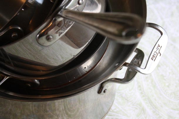 Oh, my darling pots and pans! Don’t ask me about my pots and pans, unless you have a lot of time on your hands. I could talk for hours about them. All-Clad should pay me for the time I’ve put into raving about their cookware. My pots and pans are the prized gems of my collection. I’m an All-Clad girl through and through; copper-core, given my druthers. I’d rather save my money for one good All-Clad pot than fill up my cupboard with a collection of something else. In my opinion, this cookware is as good as it gets. Truth be told, these pots and pans are not cheap. But, they will last you forever. You’ll pass these pots and pans onto your grandchildren. Seriously. Don’t worry about trying to buy a whole collection at once. You’re better off buying a pot or pan at a time based on your needs. Whatever you choose, look for cookware that’s sturdy with solid construction. Avoid pots and pans with a disk base, which will be more likely to warp if overheated. I’ve had that happen more than once in my pre-All-Clad days. I’d recommend that most of your pots and pans are a high quality stainless steel, which is most durable and won’t interact with foods. Look for cookware that is oven safe, since it’s a really convenient thing to be able to move a pan from stove top to the oven. I’m leery of non-stick surfaces due to health concerns, though I do keep at least one non-stick pan on hand for omelets. My favorite cookware, the All-Clad Copper-Core line, features a five layer construction with the durability of stainless steel on the interior and exterior sandwiching layers of highly conductive, even-heating aluminum and copper. It’s also handy to have a good cast-iron skillet, grill pan, and dutch oven on hand. Le Creuset makes excellent and beautiful enameled cast-iron cookware.