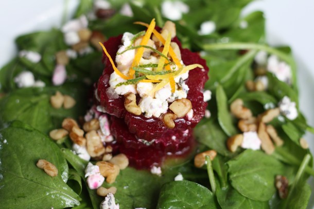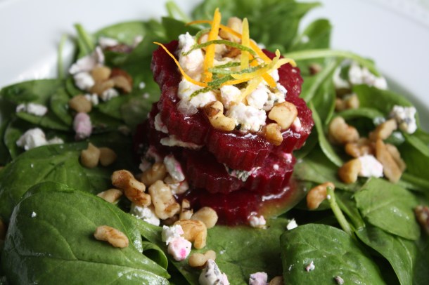 Toss the spinach in a little dressing. Create a tower of alternating layers of roasted beet slices and goat cheese. Drizzle a little extra dressing on top. Sprinkle with chopped walnuts and citrus zest.