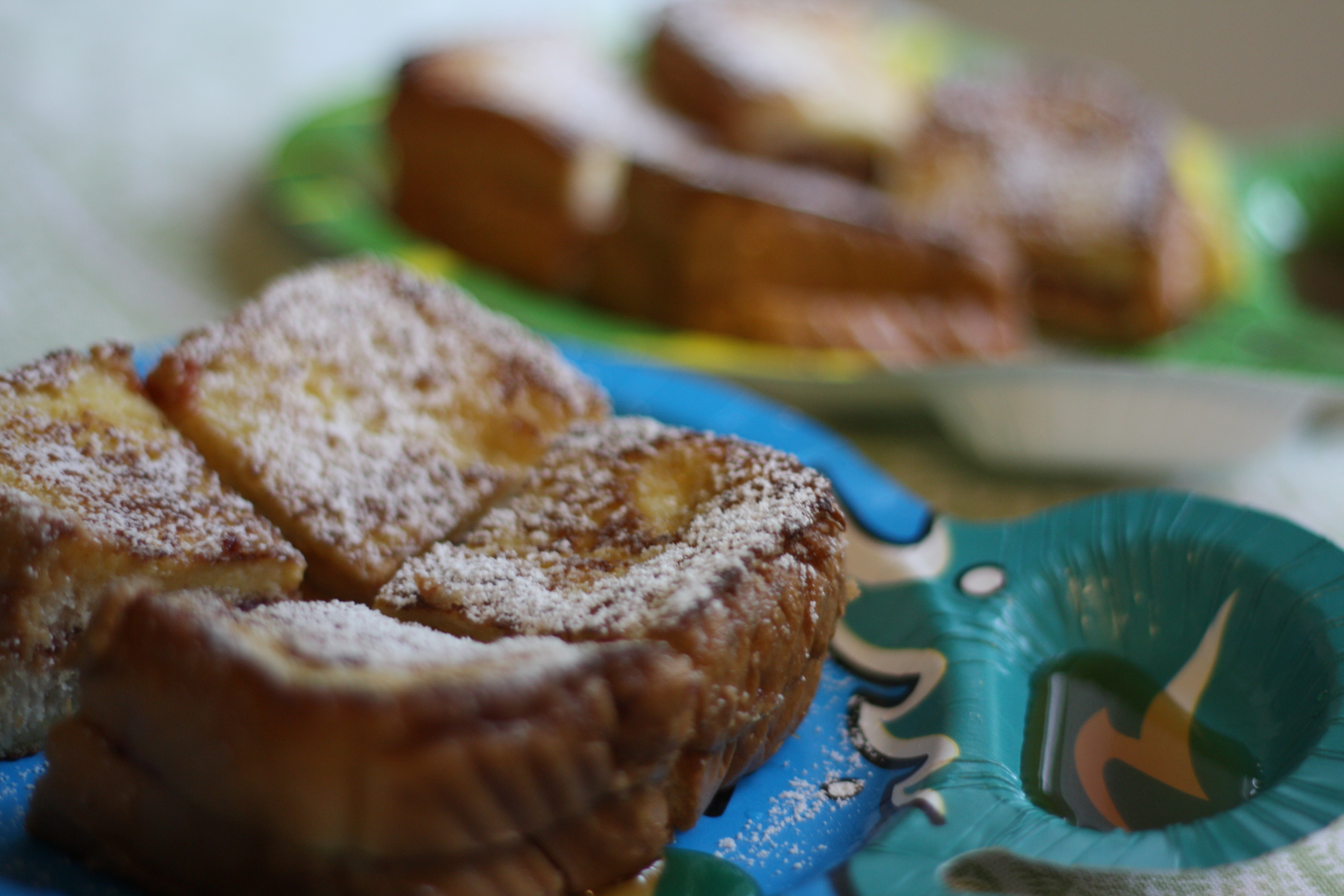 So, when it came time to make dinner this evening, I wanted to make something a little special for the kids;  a little treat at the end of a long week.  My first thought was breakfast for dinner, which is always a treat in my book. Perhaps some banana-nut pancakes or maybe chocolate chip waffles. Then, I started thinking about my comment yesterday, about my picky eater’s love for peanut butter and jelly sandwiches. And that is how we ended up eating Peanut Butter and Jelly French Toast for dinner.
