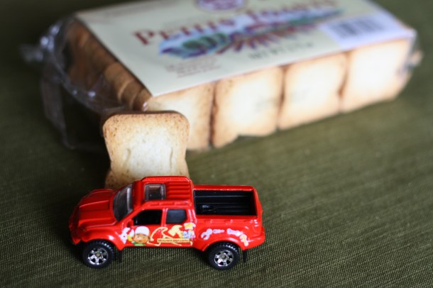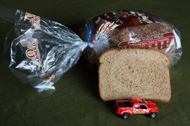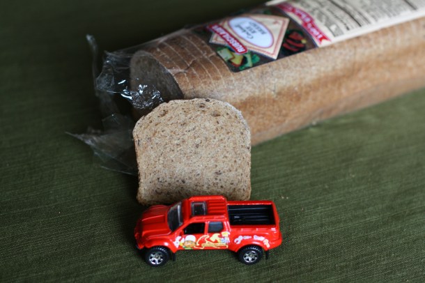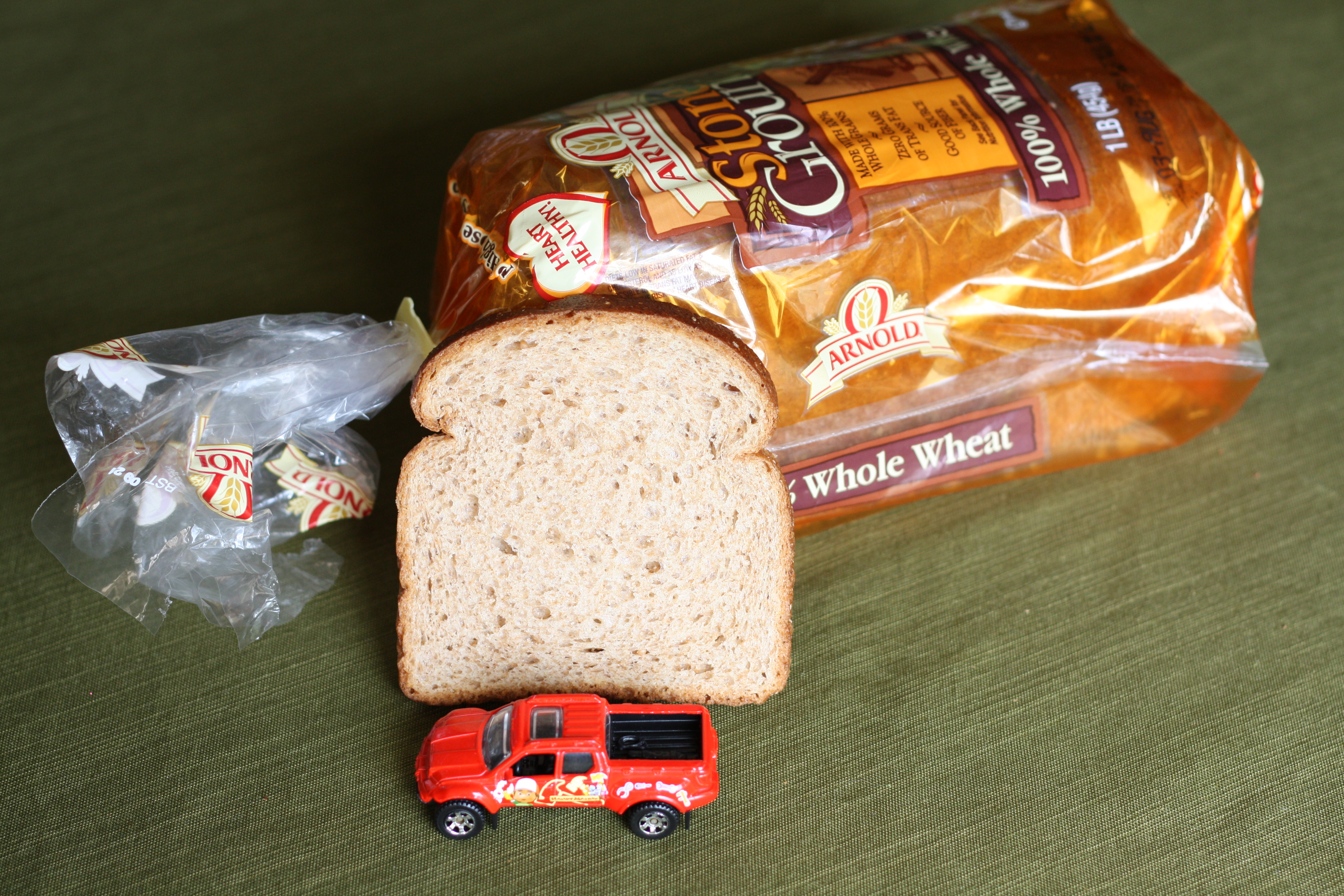But he persists. On and on about the gigantic bread. I can’t listen to it anymore. So, I go to the supermarket with my ruler in hand. Ok, not really. But, I did spend a lot of time in the bread section, holding one loaf up to another and scrutinizing the weight and dimensions of each loaf. And I found a suitable loaf of wheat bread.