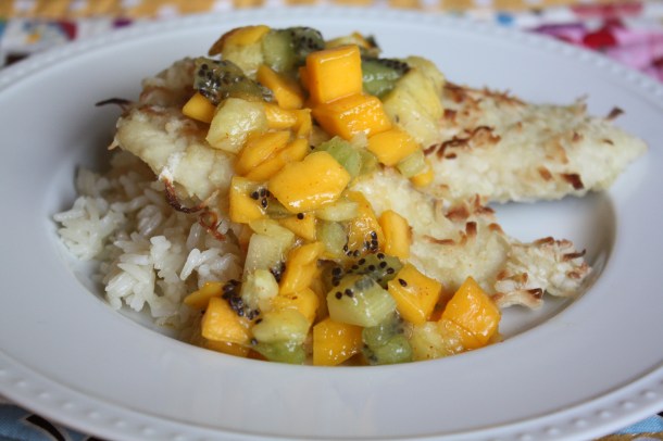 I make a similar recipe with macadamia nuts mixed in with the coconut crust, drizzled with a vanilla-infused macadamia nut oil I picked up somewhere. It’s such a nice way to enjoy tilapia, especially topped with fruit!
