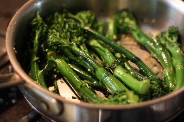 Bring a pot of water to a boil. Blanch the broccolini, by placing it in the boiling water and cooking for 5-7 minutes. Remove from the boiling water and gently pat dry. In a pan, heat olive oil over medium heat. Add the garlic and cook for a minute or two. Add the blanched broccolini. Toss in the oil and garlic. Cook for 2-3 minutes. Season with salt and pepper, to taste