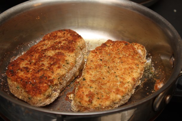 Preheat oven to 400 degrees. Trim any excess fat from the chops. Season with salt and pepper. Dip the chops into the beaten egg, then press all sides in the bread crumbs until thoroughly coated. Heat the olive oil in an oven-proof pan. Place the breaded chops in the pan and cook for a minute or two on each side until golden brown. Place the pan in the oven and cook until the pork chops are fully cooked. Time will vary depending on the thickness of the chops. My 1″ pork chops took about 15 minutes in the oven. A instant read thermometer inserted into the center should read 165 degrees.