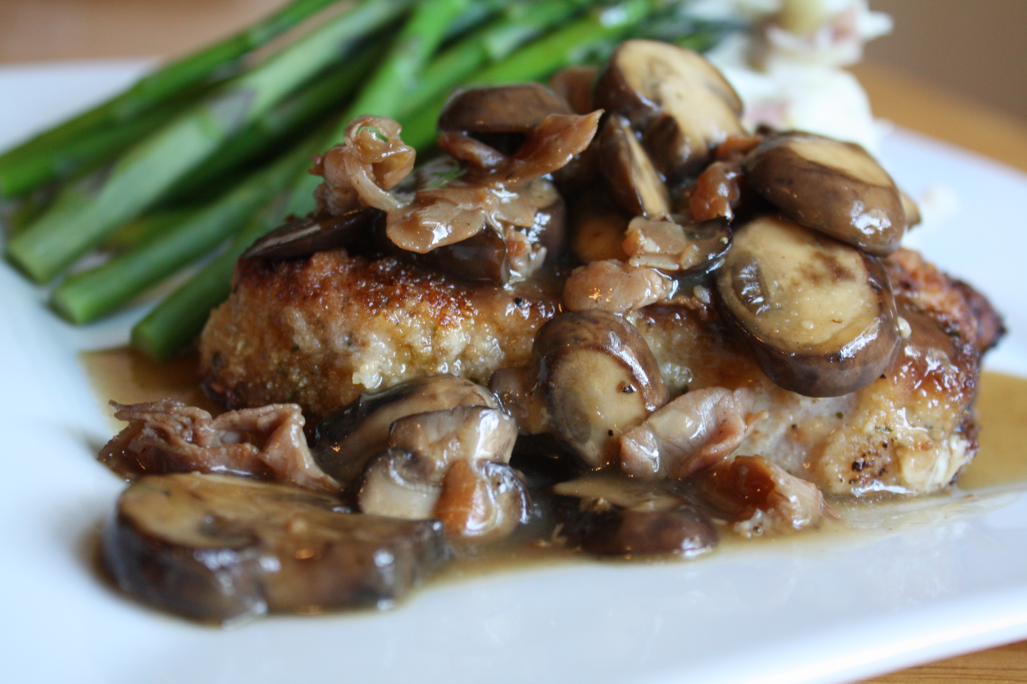 So, when I found myself sitting in front of the Bonefish Grill menu, there was part of me that was very strongly leaning towards ordering the Filet Mignon with Gorgonzola Butter, so that I could dissect the dish and discover the errors of my almost perfect recreation. And then I spotted the Fontina Chop; a pork chop with Marsala sauce, prosciutto, garlic, and fontina cheese. Just reading the description had me salivating. I almost always order steak or seafood in restaurants, so a pork dish was a departure for me. But it sounded so irresistible. And it was. It was probably the best rendition of a pork chops and gravy dish I’ve ever eaten. If you ever find yourself in a Bonefish Grill, I highly recommend this dish.