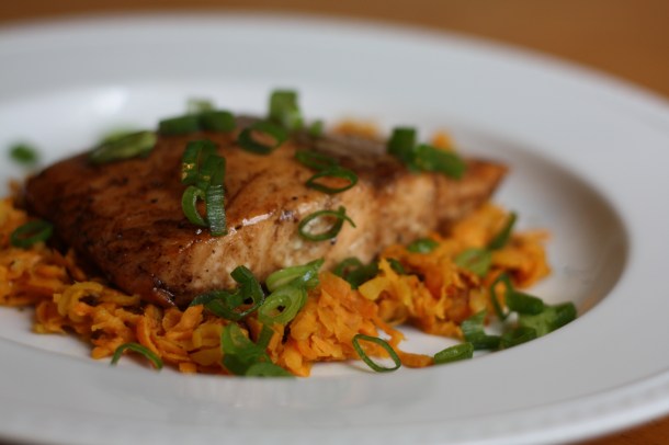 Honey-Balsamic Salmon over Gingered Sweet Potato and Apple Hash