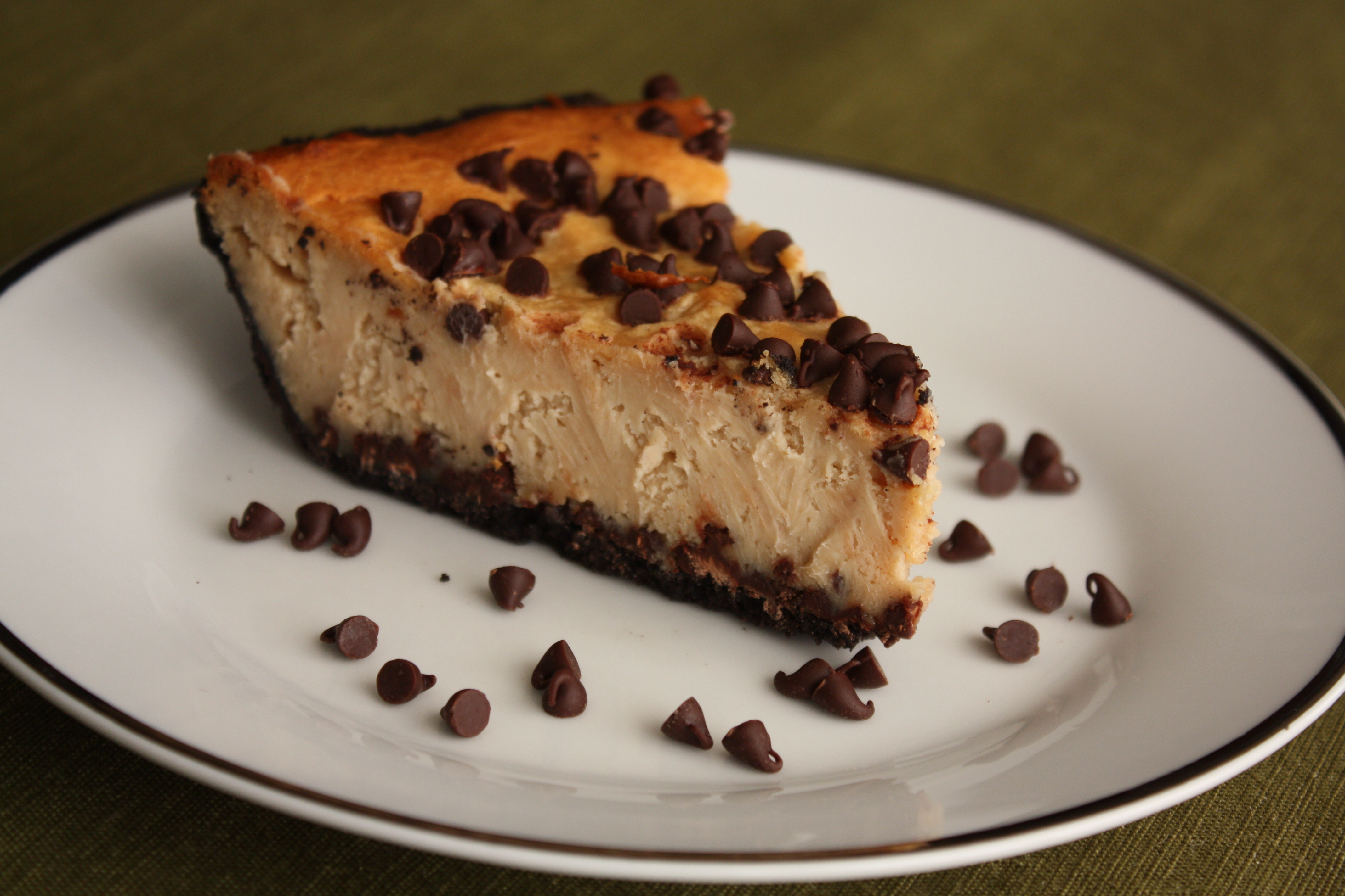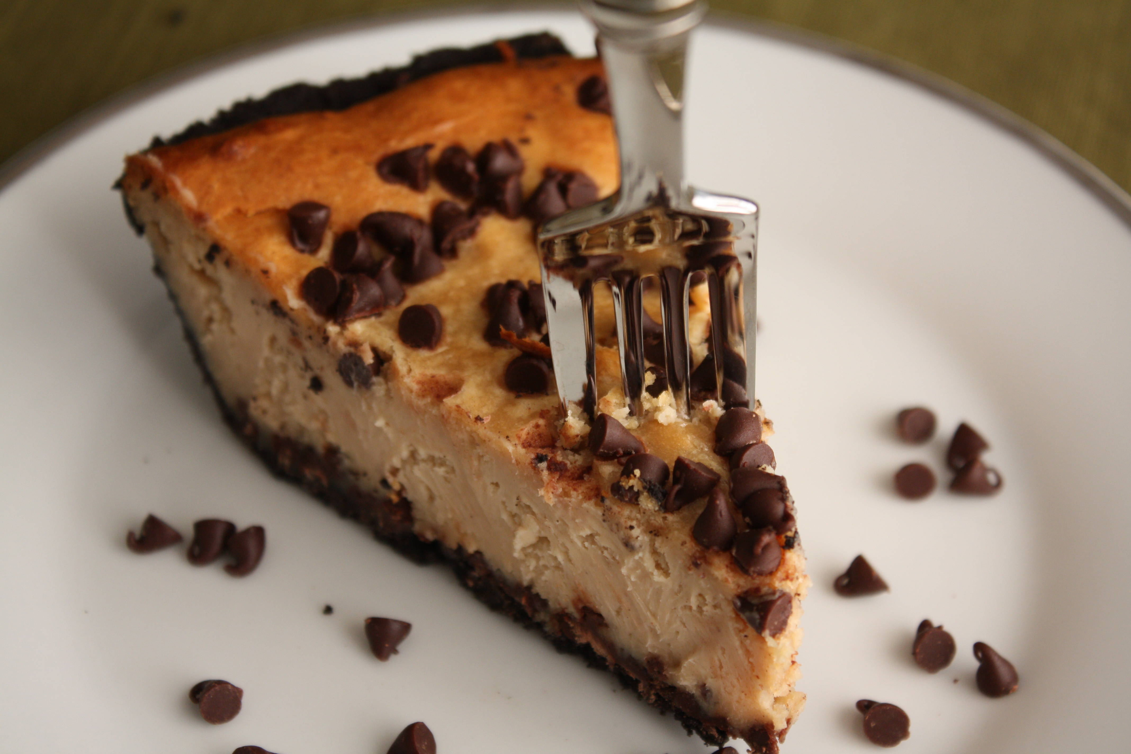 For today’s version of this fantastic flavor combination, I’ve made a peanut butter cheesecake, sprinkled with chocolate chips and baked in a chocolate cookie crust. It’s super simple to make and incredibly satisfying.