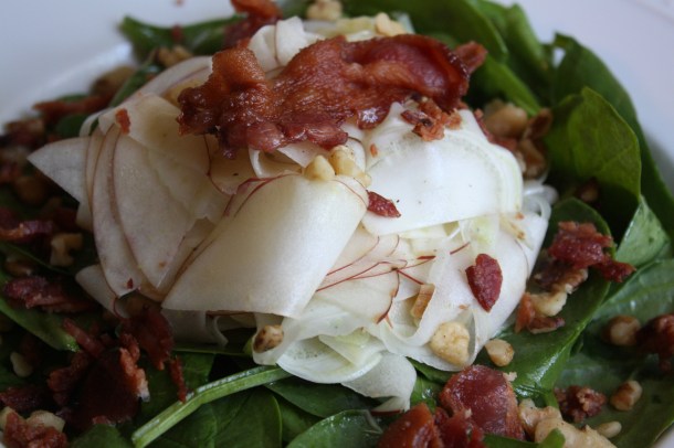 Cut the apples in half and remove the core. Cut the fennel bulb in half. Using a mandoline slicer, very thinly slice the apples and fennel bulb. If you don’t have a mandoline, use a knife to slice the apples and fennel as paper-thin as possible. Make the dressing by whisking together all ingredients. Toss the spinach in a small amount of dressing. Divide the spinach onto four plates. Toss the apples and fennel in a small amount of dressing. Place a mound of the dressed apples and fennel on top of the spinach. Top with walnuts and crumbled bacon.