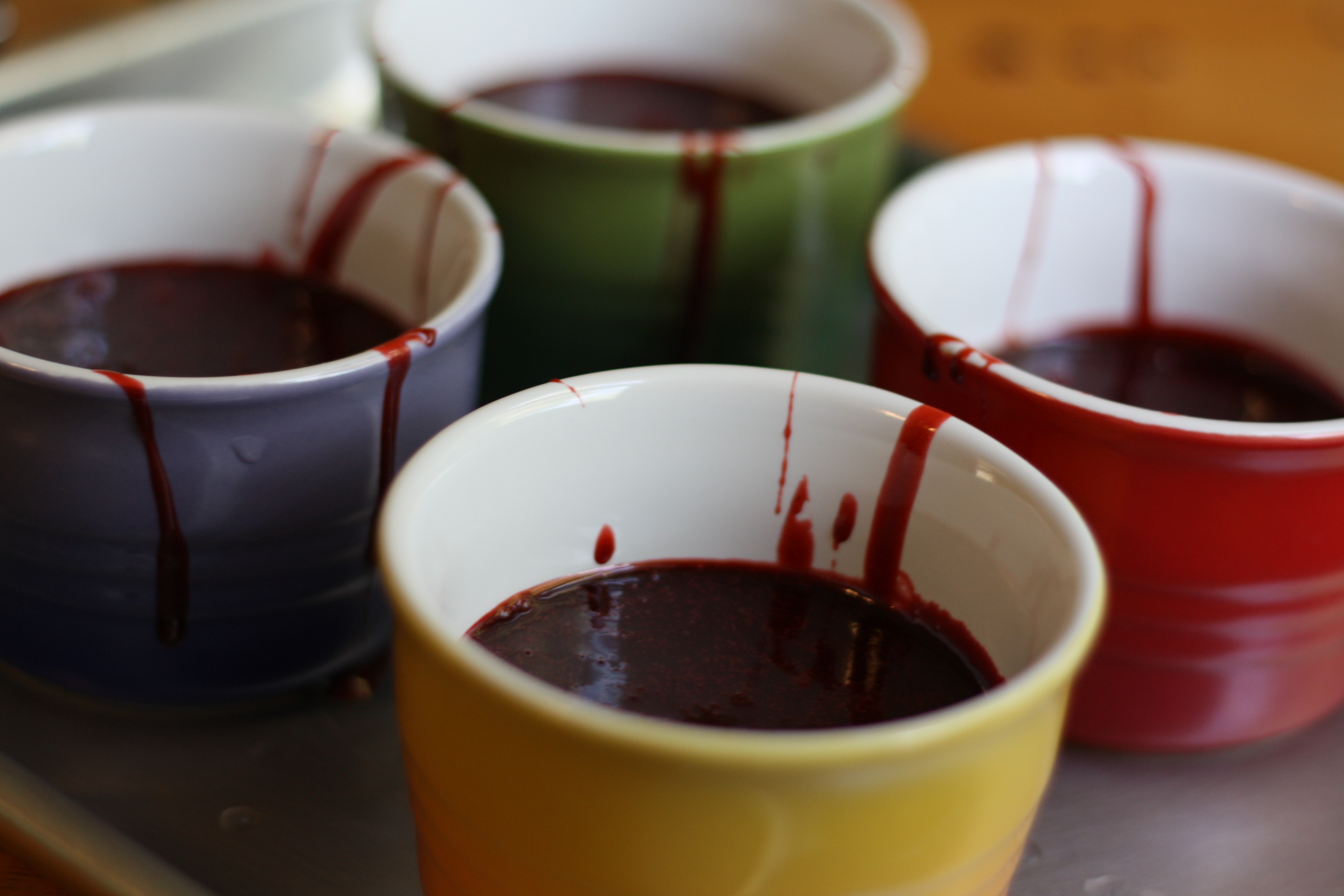 These little cakes would be a great treat for a Dexter viewing party or even for a Halloween gathering. And aside from being a cute, kitchy TV-themed treat, they’re actually a really delicious dessert. I started with a traditional recipe for Molten Lava Cakes and adjusted from there to achieve a rich, red color and a white chocolate-orange flavor. The batter comes together in a pinch and they only take 14 minutes to bake!