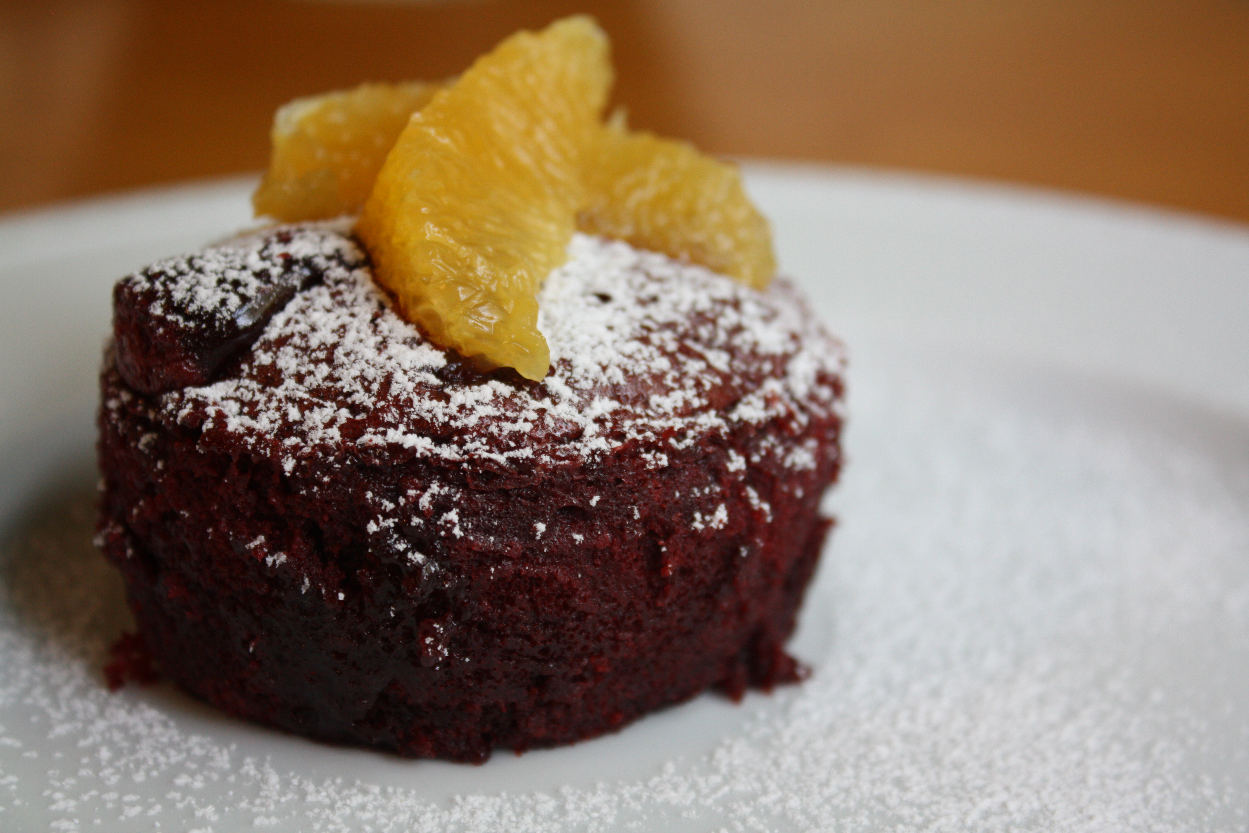 Preheat oven to 425 degrees. Grease four ramekins with butter or vegetable shortening. Melt the white chocolate chips and butter over a double boiler or in the microwave, stirring until smooth. Add the flour, sugar, and cocoa. Stir to combine. Add the eggs, egg yolks, and liquer. Stir until smooth. Add several drops of red gel food coloring and stir. Equally divide the batter amongst the four ramekins. Place the ramekins on a baking sheet and bake on the middle oven rack for 14 minutes. Remove from the oven and allow to cool for a minute or two. Run a knife around the edges of the cake to loosen. Then, invert the cakes over a serving plate. Sprinkle with confectioner’s sugar and garnish with orange supremes. Serve immediately.