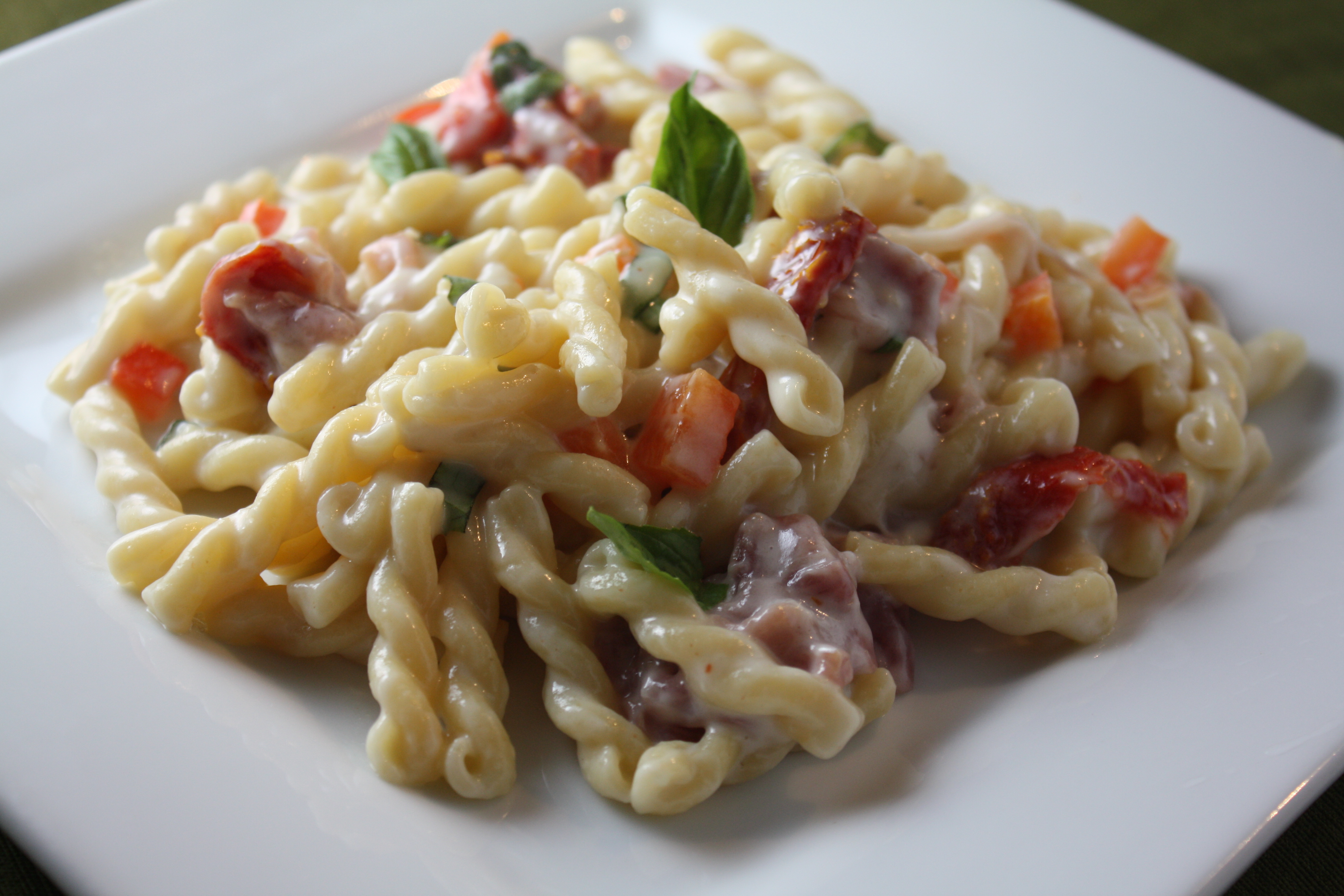 Just like with my Spicy Bacon Mac and Cheese, I started with a basic base of thickened milk; a roux made of 3 tablespoons of butter and 3 tablespoons of flour, then 2 cups of milk. Skim milk works perfectly fine for this step. You might as well save yourself the calories and fat where you can in this indulgent treat. To this basic thickened milk base, we’ll add the cheese. Here’s where you can have fun! For our Italian-style mac and cheese, I used a blend of smoked mozzarella, provolone, and parmigiano-reggiano. Mozzarella has got some major gooey-factor going on. Delicious! Finally, we’ll throw in a few extras; homemade roasted red peppers, prosciutto, julienned sun-dried tomatoes, and a little basil chiffonade.