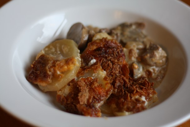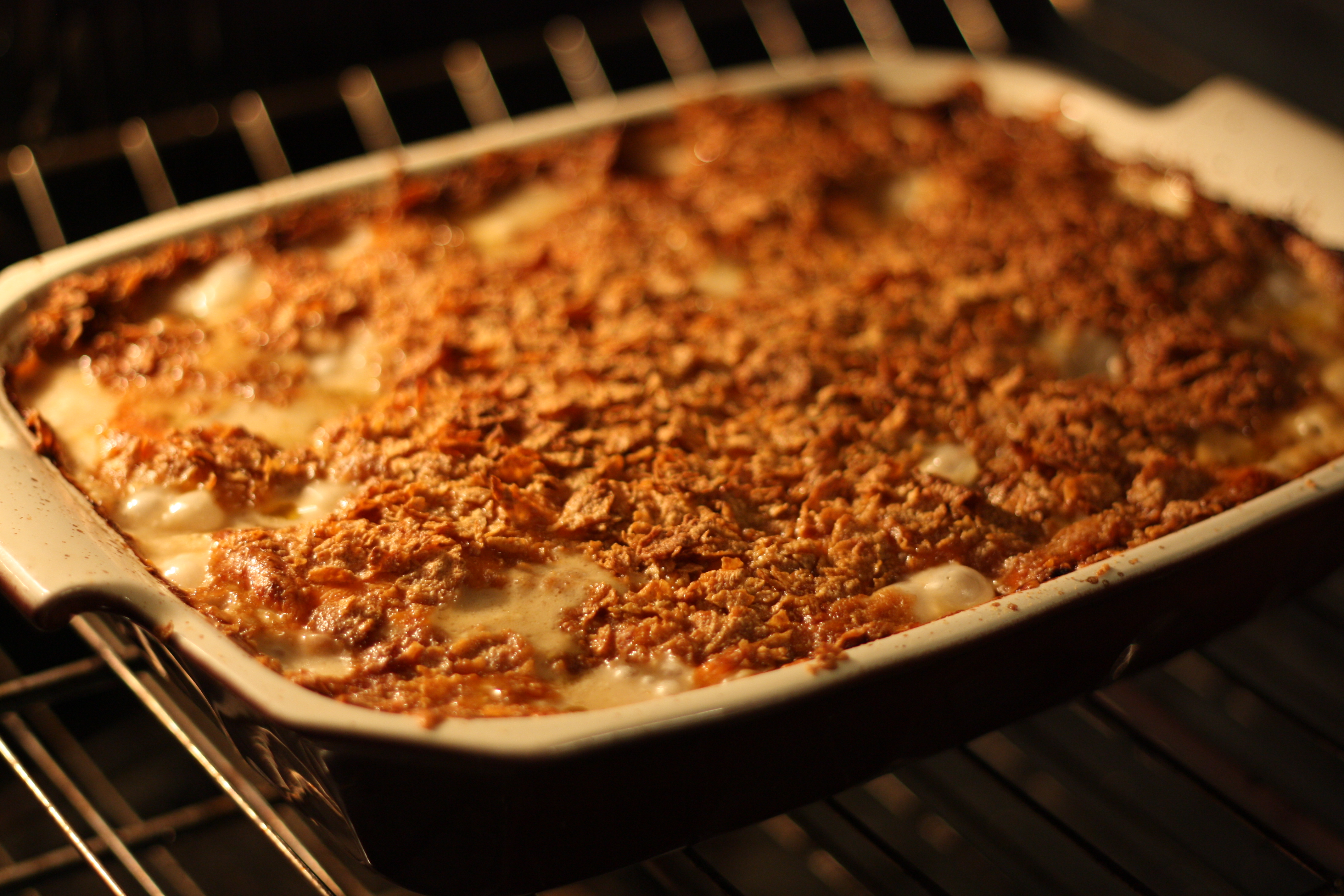 Preheat oven to 350 degrees. Pour the beef, onions, and cooking liquid into a large (13×9) baking dish. Arrange the mushroom slices in an even layer over the beef. Arrange the potatoes in an even layer over the mushrooms. In a small bowl, combine the sour cream, cream of mushroom soup, and milk. Season with salt and pepper, to taste. Spread the mixture over the potatoes. Top with cheddar cheese, then crushed Wheaties. Bake for 1 1/2 – 2 hours. Allow to cool for about 15 minutes before serving.