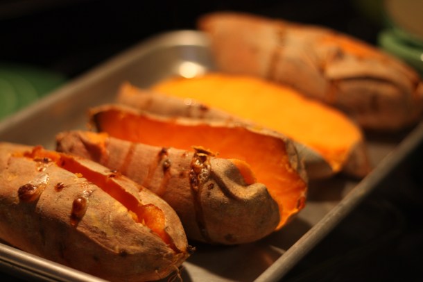 Preheat oven to 375 degrees. Wash the sweet potatoes and pierce the skin several times with a fork. Place the sweet potatoes on a baking sheet and bake for about 90 minutes until fork-tender. Remove from the oven and allow to cool.