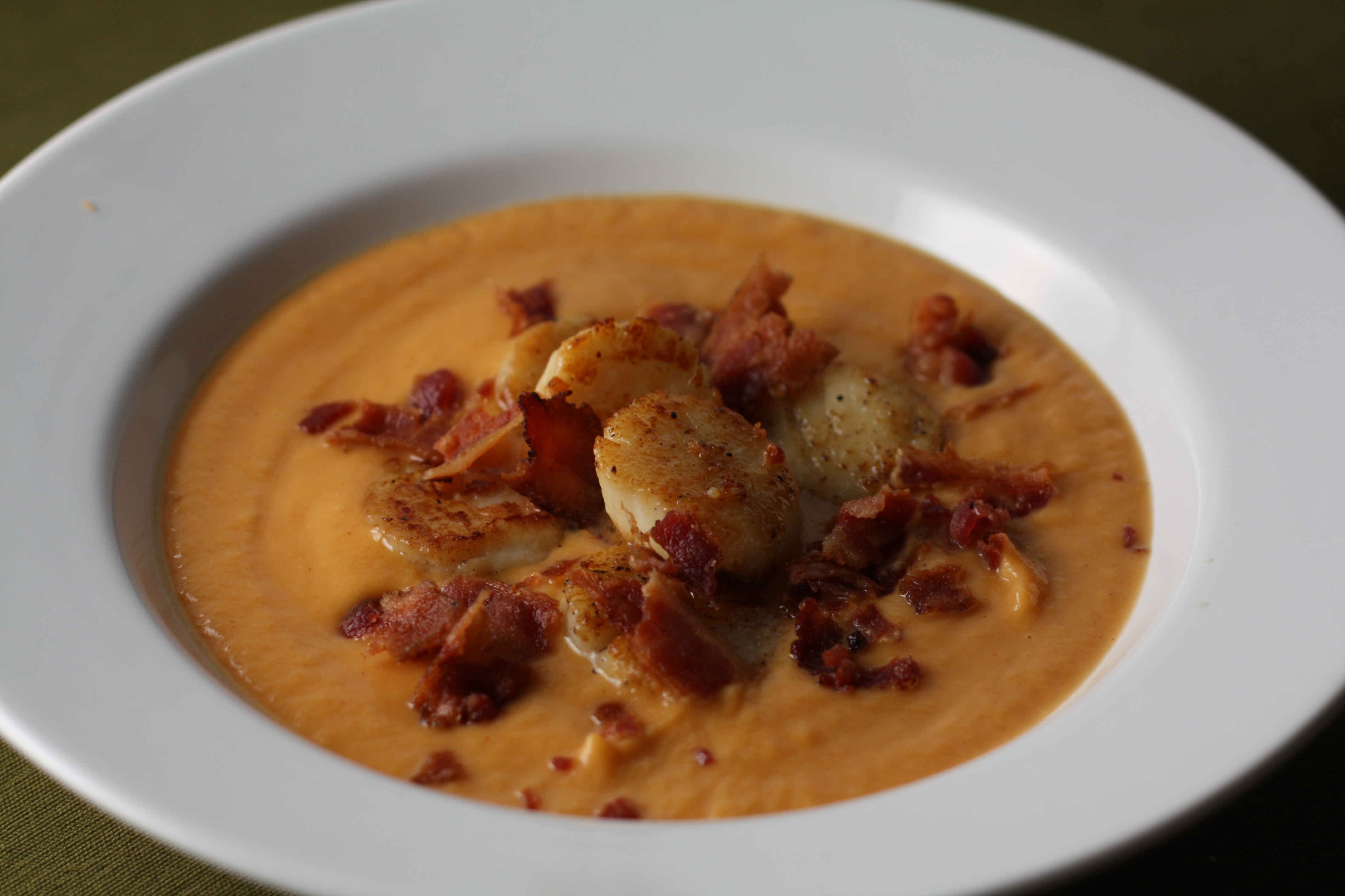 When it comes to creamy, bisque-style soups, I’ve got a little weakness for serving them with a bit of fresh seafood showcased in the center. (See my recipe for Chilled Avocado Soup and Crab Cake with Chipotle Remoulade.) A bit of crunch in the form of crispy bacon, croutons, seeds or nuts never hurts too. These little touches of flavor and texture turn a simple bisque into a simply elegant meal. I’m pairing my sweet potato bisque with a few seared sea scallops and some crispy applewood-smoked bacon for a fantastic autumn meal.
