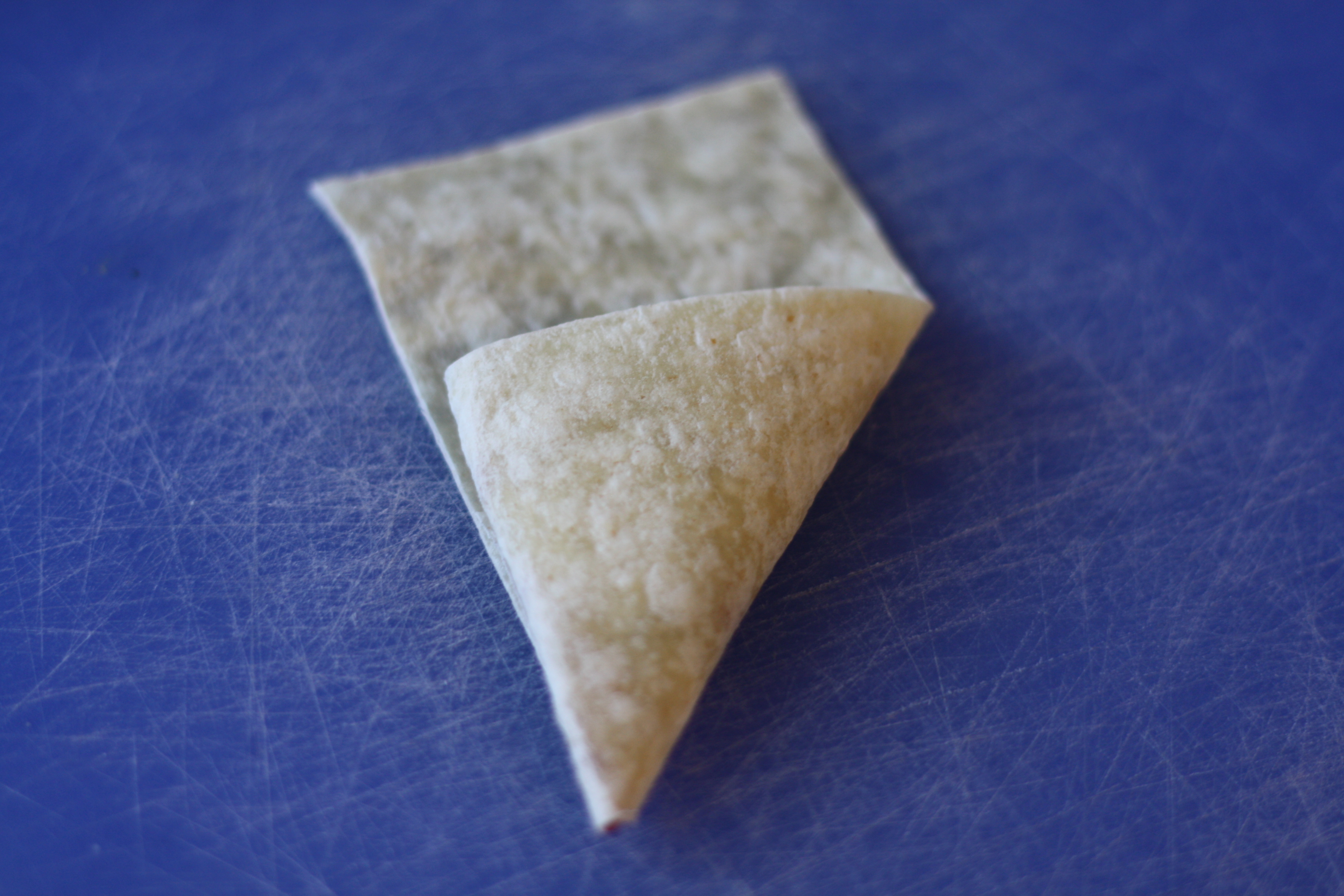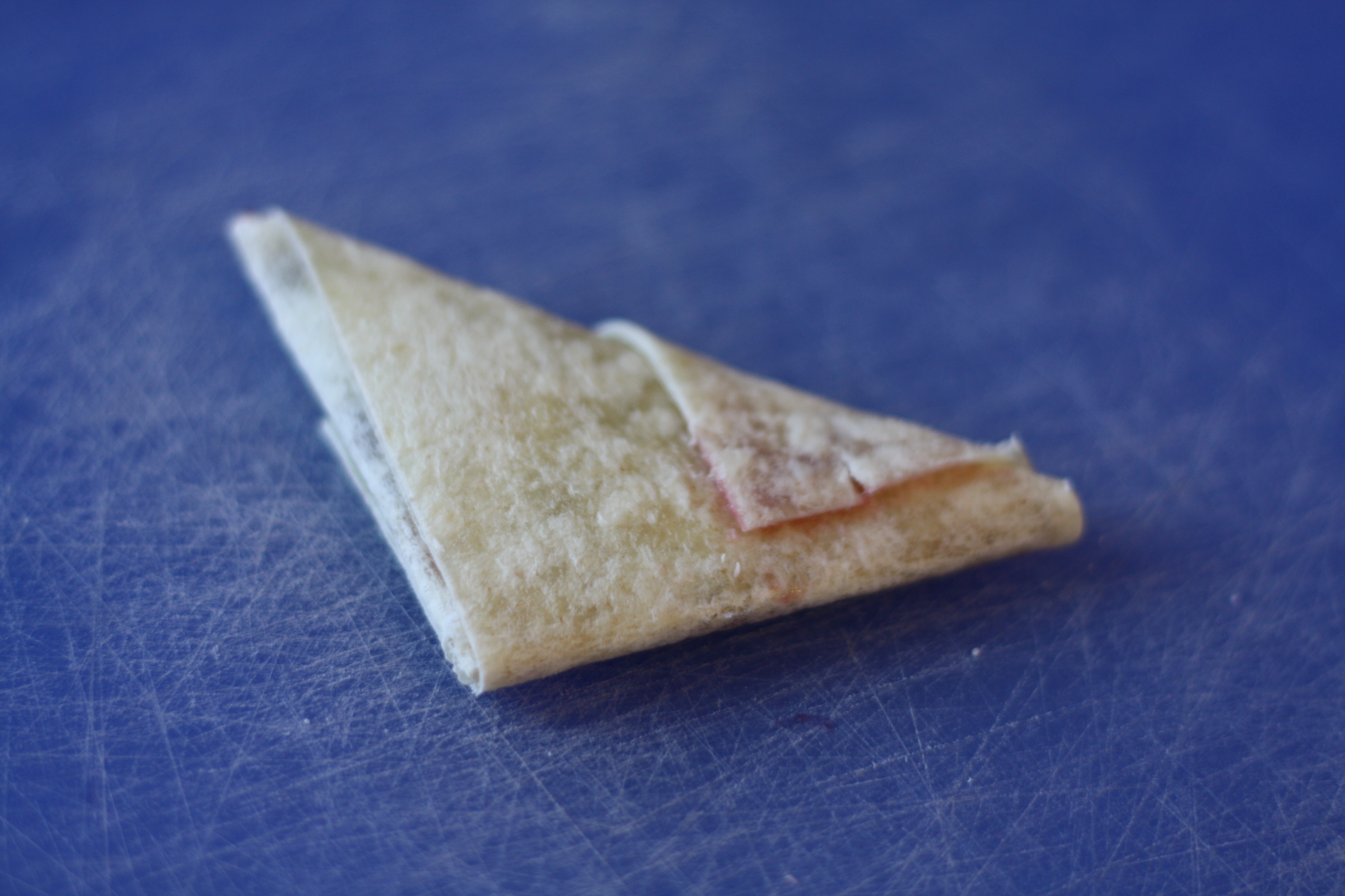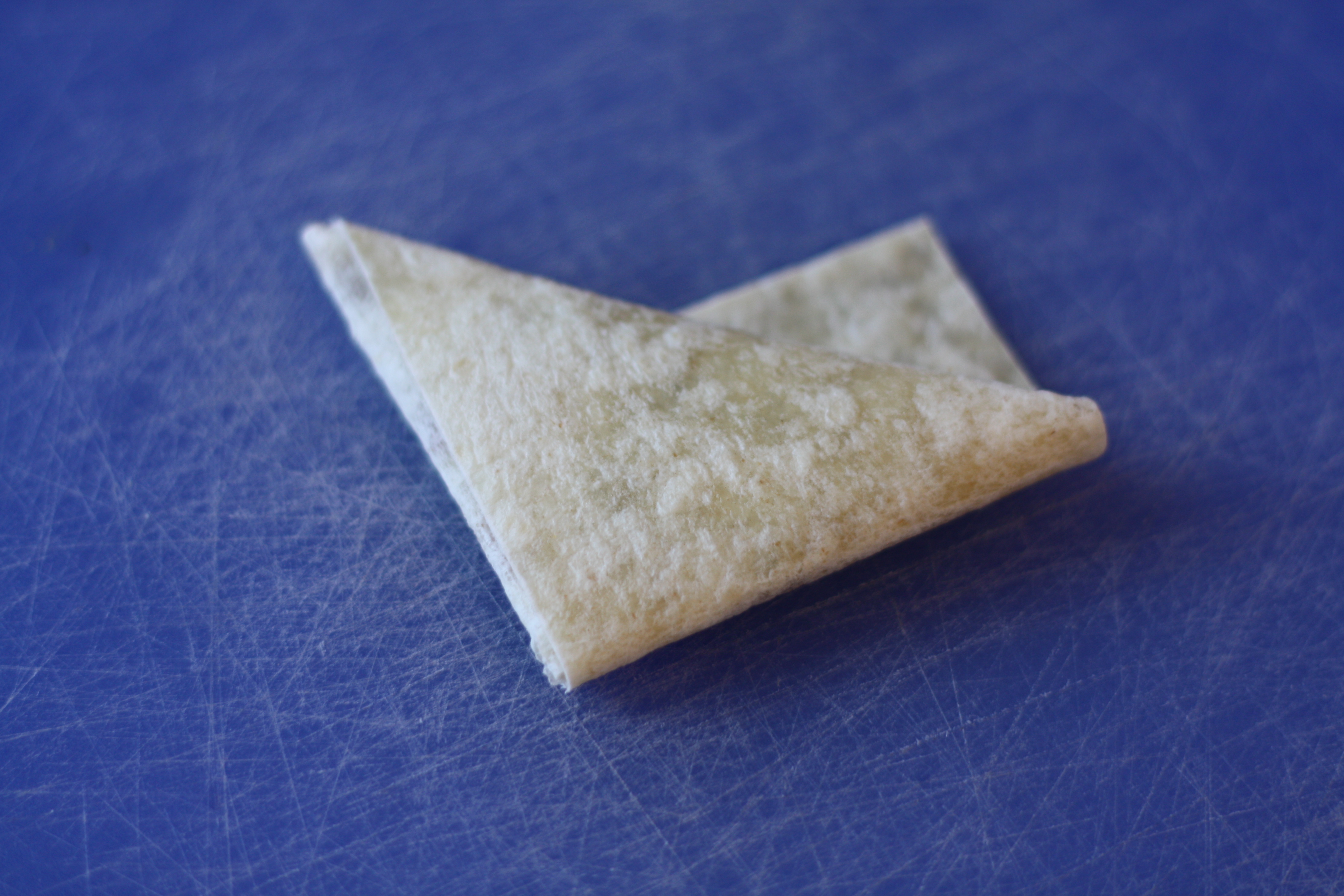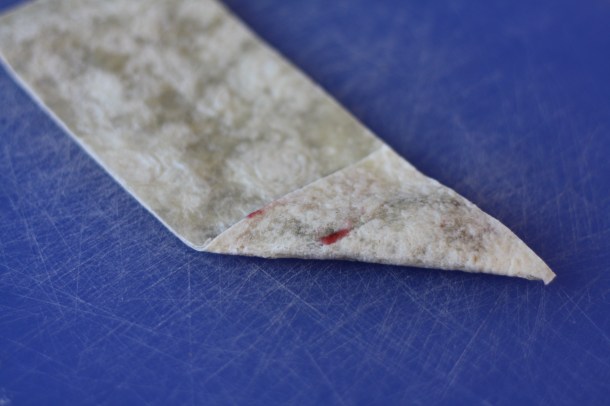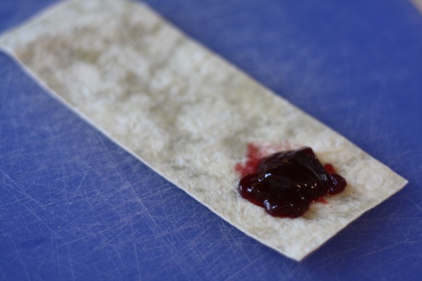 When I prepared the spanakopita, I didn’t have the forethought to take step by step pictures for a folding photo guide. It wasn’t until I sat down to write up this recipe that I realized a photo guide would have been really helpful. Since my spinach filling and phyllo dough are long gone, I’ve made up a little photo guide using a piece of tortilla and raspberry jam which, as it turns out, make a pretty tasty snack. The following pictures should help give you an idea of how to fold the spanakopita.