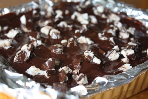 Preheat oven to 350 degrees. Line an 8×8 baking dish with foil. Combine crushed cookies with melted butter. Press the cookie mixture into the bottom of the baking dish. Bake for about 15 minutes.