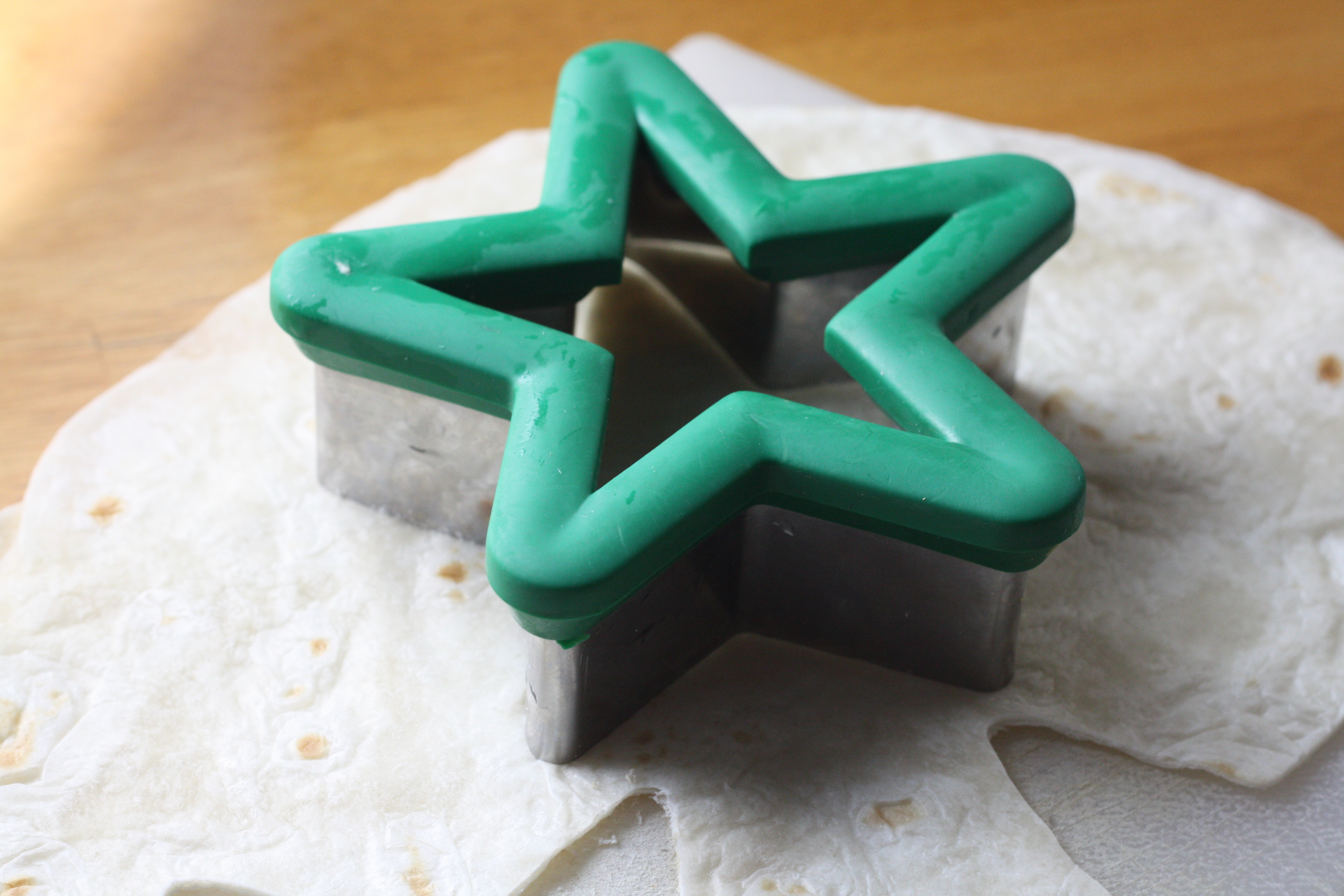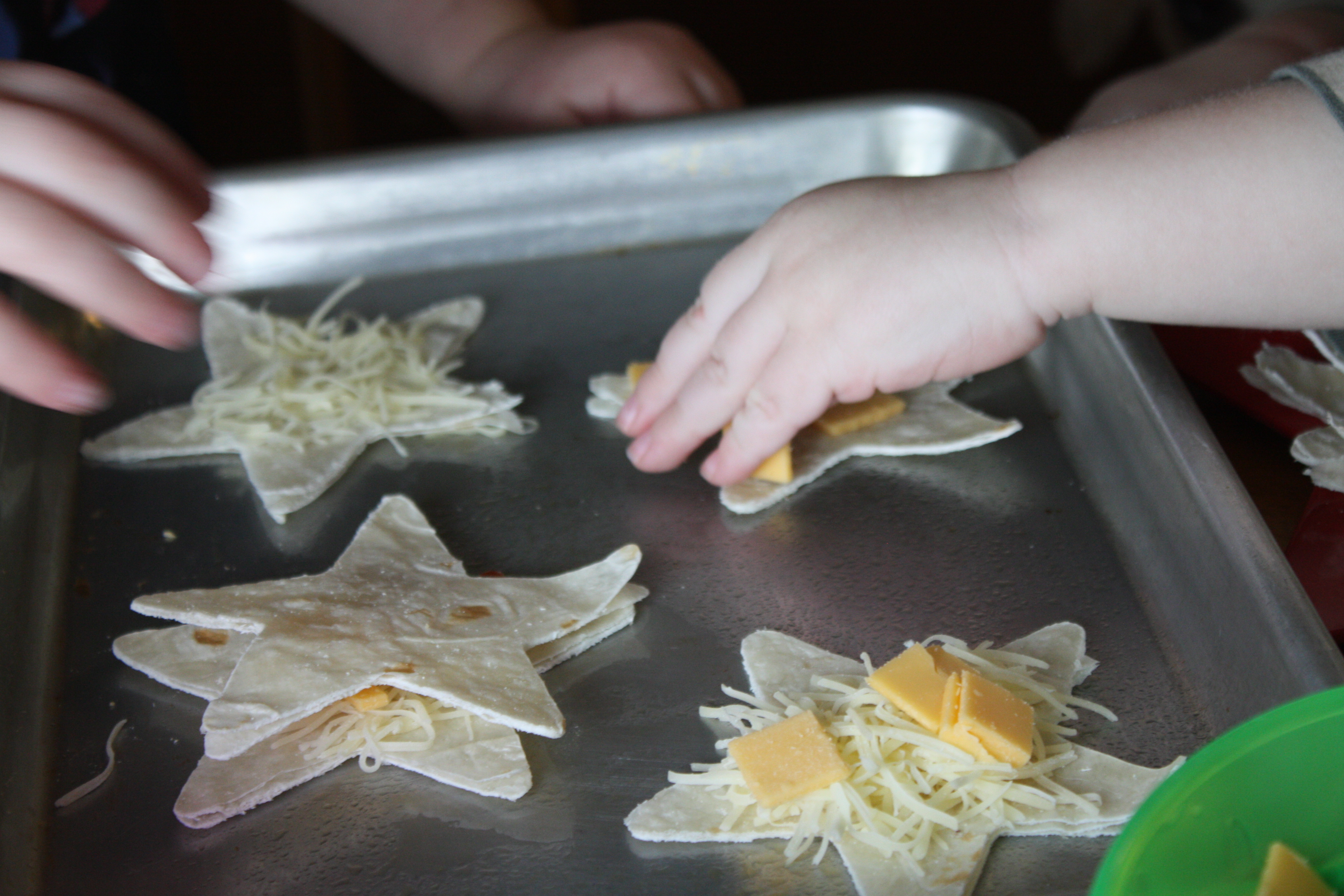 To facilitate the quesadilla construction, I organized several bowls of quesadilla fillings including the ingredients for our Reuben Quesadillas, along with some familiar favorites, such as American cheese and mini turkey pepperoni pieces. To add a little simple fun to the kids’ quesadillas, I used a large cookie cutter to cut star-shaped pieces from the flour tortillas. As they worked, I encouraged the kids to taste each of the ingredient options, but allowed them the flexibility to build their custom quesadillas as desired.