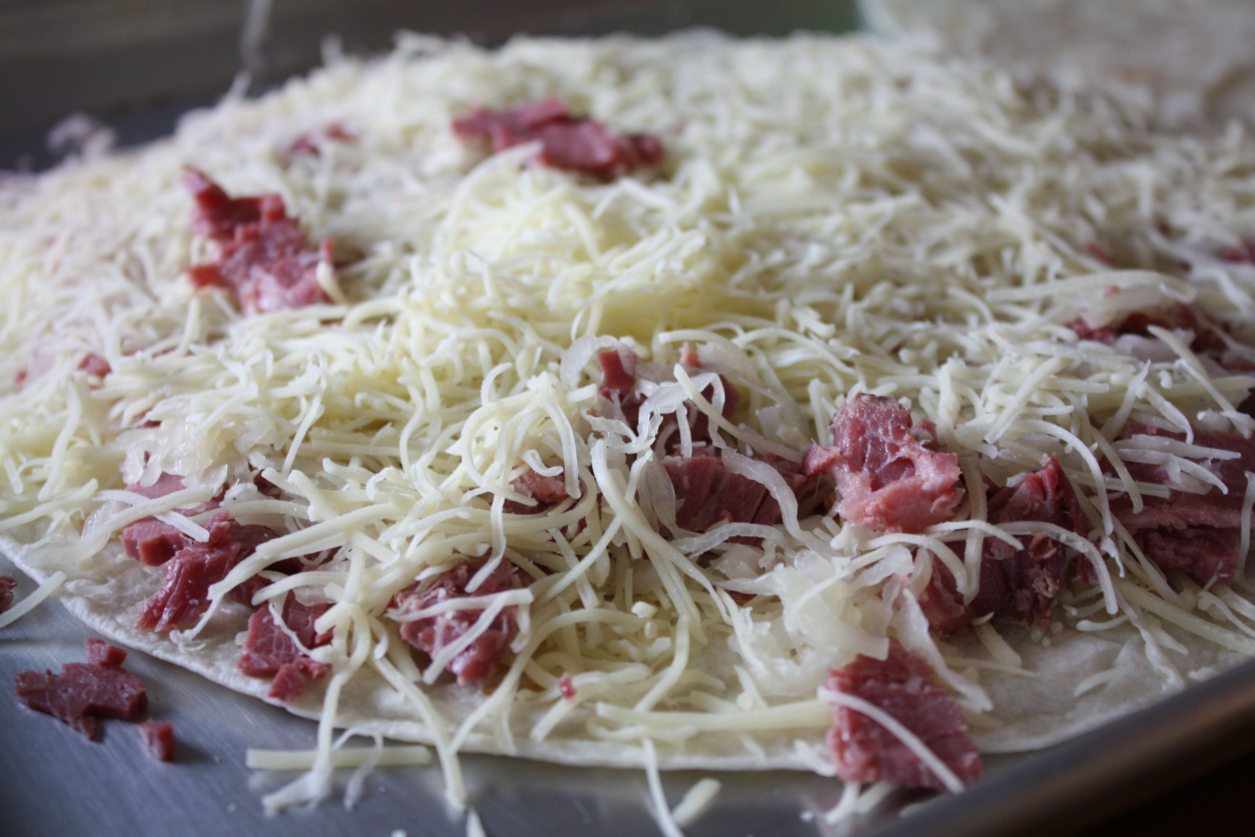 Preheat oven to 375 degrees. Spray a baking sheet with cooking spray. Place one flour tortilla on the baking sheet. Sprinkle with shredded swiss cheese. Scatter pieces of corned beef and sauerkraut over the cheese. Sprinkle with additional swiss cheese and top with another flour tortilla. Bake for 10-15 minutes, until the filling is hot and melty and the tortilla is slightly crisp. Serve with Thousand Island dressing.