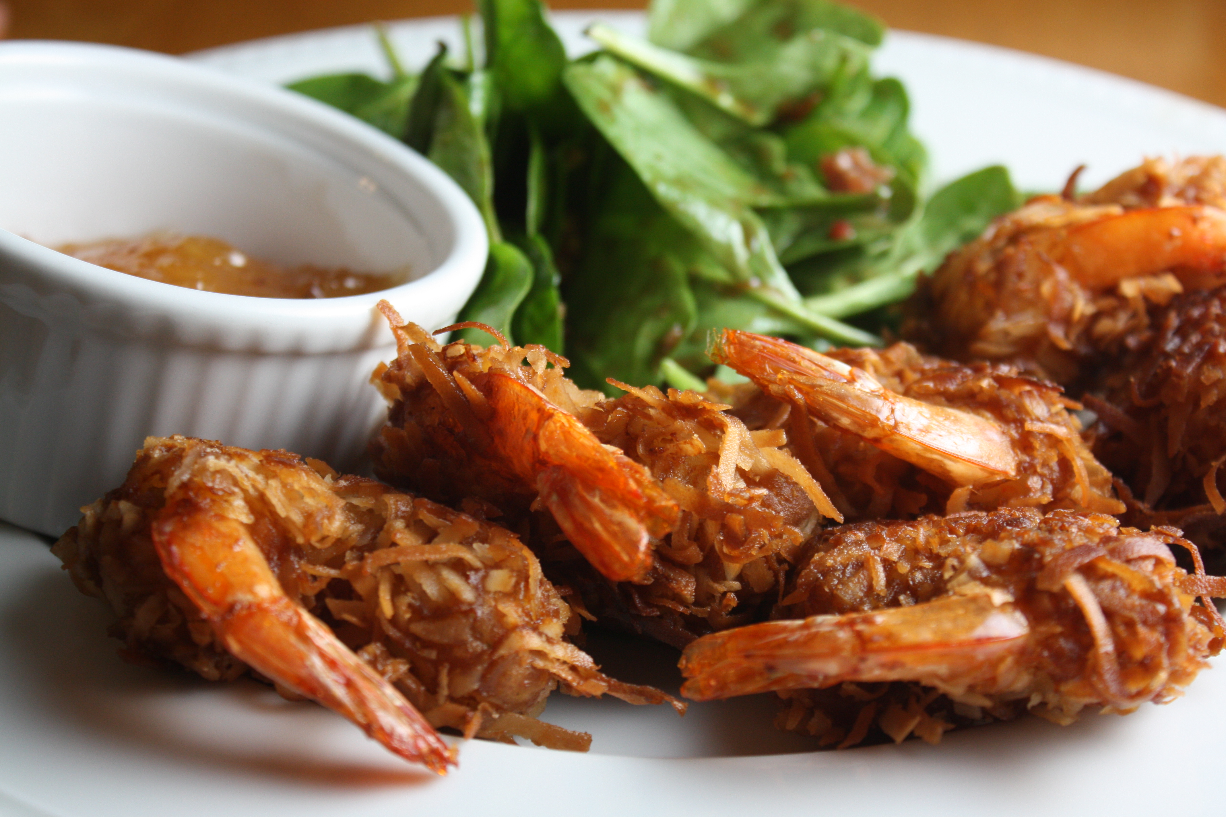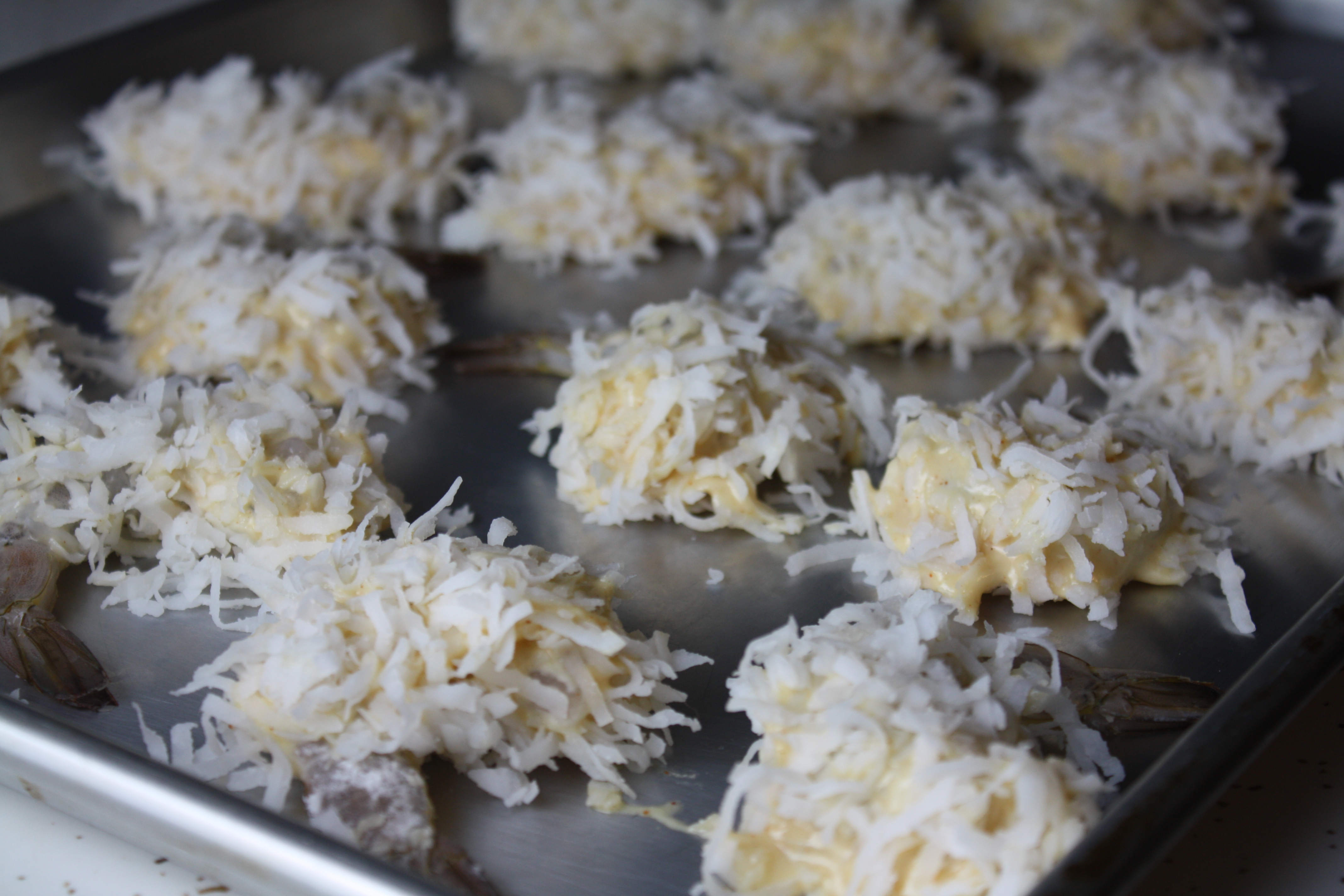 To prepare the shrimp, arrange a plate of flour, the bowl of batter, and a plate of the coconut. Holding by the tail, press each shrimp in the flour to lightly coat. Then, dip into the batter and allow the excess to drip away. Press into the shredded coconut to cover both sides. Place the coconut-coated shrimp onto a baking sheet until you’ve prepared all of the shrimp.