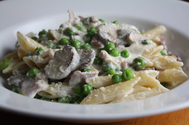 Penne Pasta in Parmesan Cream Sauce with Prosciutto, Portabellas, and Peas