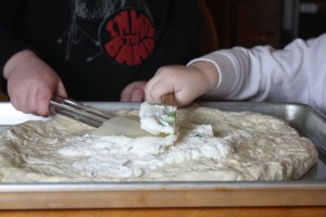 Kids Cook Monday series, I invited my little helpers into the kitchen. Pizza making is ripe with opportunities for young children to get involved. Stretching dough, spreading sauces, arranging toppings, and scattering cheese are ideal tasks for little hands. Kids benefit in a number of ways while cooking. They develop math skills while measuring, fine motor skills while spreading and arranging pizza toppings, health and safety skills while washing up before cooking, and language skills while following directions. But, in my opinion, there’s no bigger reward than the proud smiles on their little faces as our family sits down to enjoy the meal they had a hand in creating.