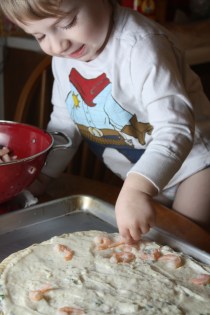 Don’t get me wrong…I love a traditional slice of saucy, cheesy pizza as much as the next person (preferably dipped in a bit of bleu cheese dressing). But there’s something about a slice of white garlic pizza which makes my taste buds do a little happy dance. And last week, my happy-dancing taste buds decided that a homemade white garlic pizza, with a generous topping of tiny shrimp, was exactly what we needed.
