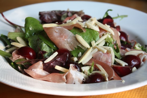When you discover that your sack of cherries just cost you 8 bucks, you make it your mission to use every single cherry before they spoil. And that is the story behind this recipe, which is more of a idea than an actual recipe; a simple, meal-worthy salad made of mixed greens, lightly dressed in a white balsamic vinaigrette and topped with fresh cherries, smokey prosciutto, and almonds. Simple, delicious, and satisfying. Best yet, it will make you feel a lot better about the 8 dollars you just spent on cherries.