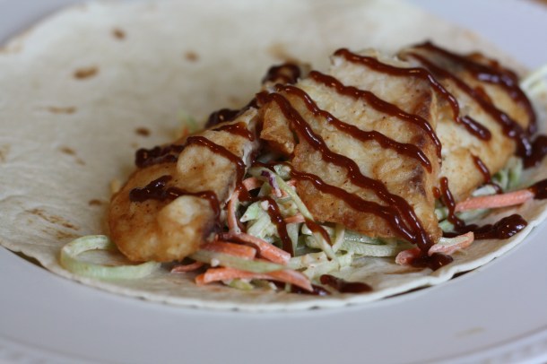 Asian-style Fish Tacos with Broccoli Slaw and Hoisin-Peanut Sauce