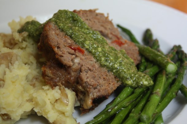The memory of that particular meatloaf made a strong case against meatloaf in my mind. For that reason, it’s a dish I rarely make. But, having found myself with a freezer full of ground beef (part of my attempt at trimming our grocery bill), I decided a meatloaf was in order. In my rendition, I added a bit of sun-dried tomatoes, parmesan cheese, and melty provolone. Drizzle with fresh basil pesto and serve aside smashed potatoes and roasted asparagus for a delicious, satisfying meal.