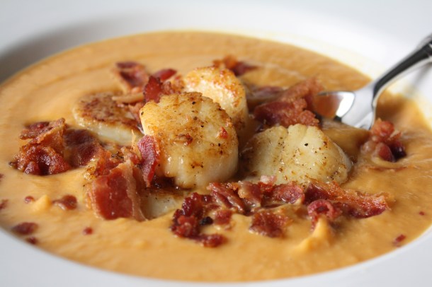 Seared Scallops over Sweet Potato Bisque with Applewood-Smoked Bacon