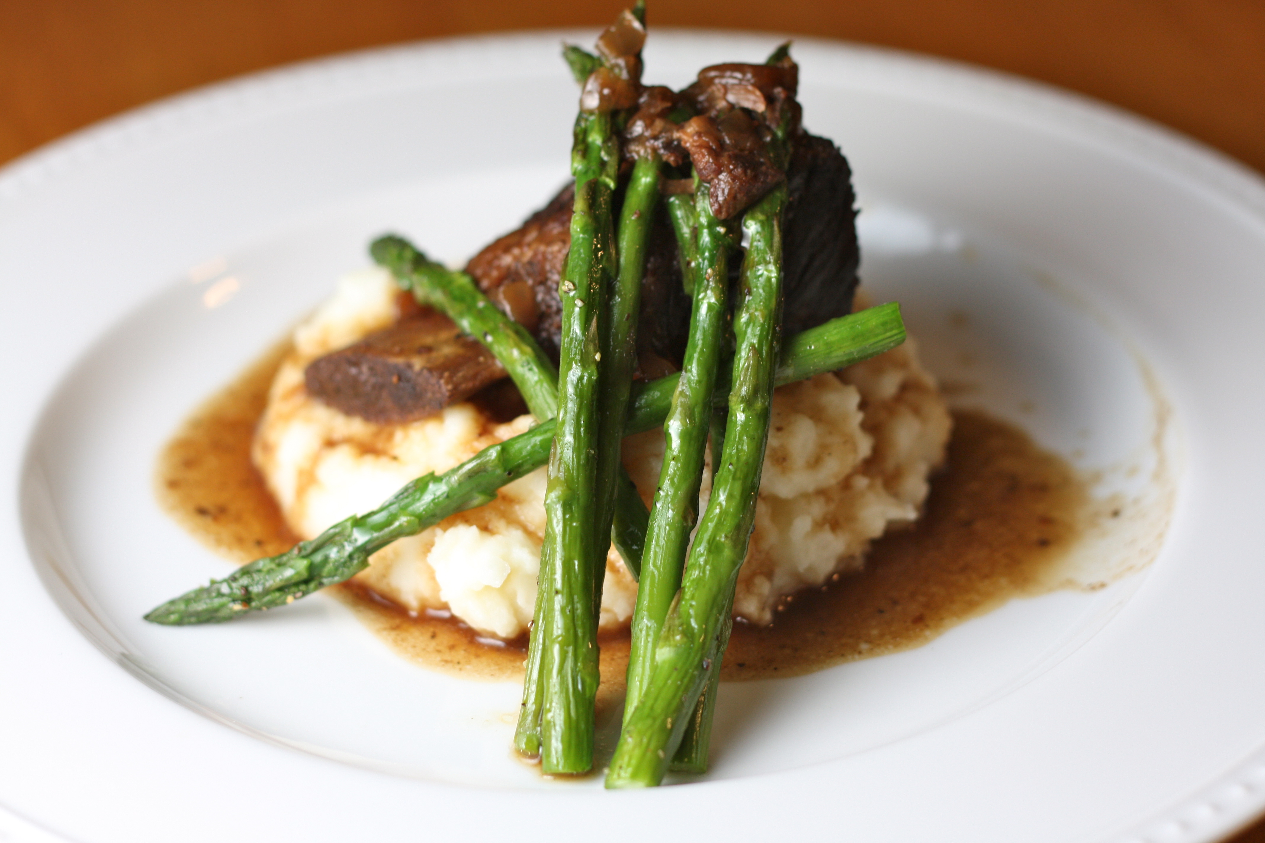 To keep things easy during the party, do whatever little preparations you can ahead of time. On the side of the short ribs, I serve creamy brie mashed potatoes, which can be fully prepared a day ahead of time, and roasted asparagus, which take only a few minutes in the oven. Get your asparagus ready for roasting by washing, cutting, and arranging on a baking sheet earlier in the day. Before roasting, toss in a bit of olive oil, salt, and pepper. Then simply pop them into the oven.