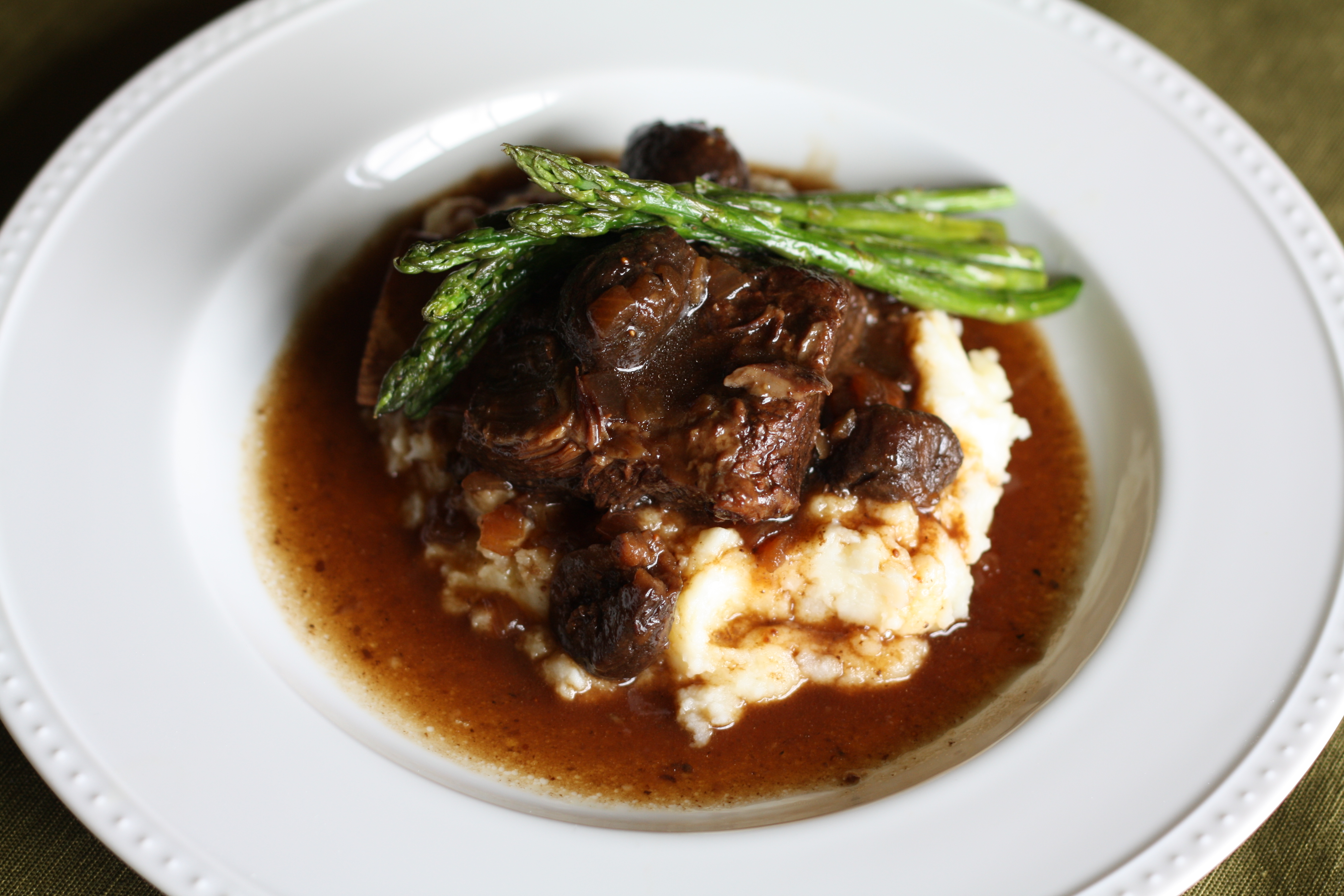 A note about the wine in this recipe: Due to the long cooking time of this recipe, almost all of the alcohol in the wine will be cooked away. But, a very small percentage may remain. (See this chart.) I prepared this recipe for an adult dinner party, so the very small percentage of remaining alcohol was not a concern for our group, but if you are preparing this dish for your family you may wish to substitute beef stock for the wine or substitute about half of the wine with a no-sugar-added grape juice and the rest with beef stock.