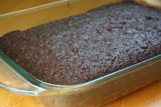Bake a 13 x 9 inch cake. Use your favorite homemade recipe or one box of any flavor cake mix. (You can bake the cake a day ahead of time, if desired.)