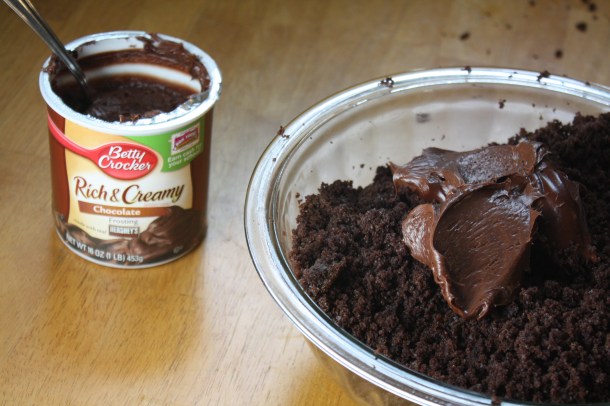 Combine the cake crumbs with any flavor frosting. A container of prepared frosting works fine or use your favorite homemade. Depending on how moist the cake is, you probably will not need the whole container of frosting. About 3/4 of a 16-ounce container should do the trick. You want the mixture to be moist enough to mold, but not too mushy. Mushy cakes will have a harder time staying on the sticks…lesson learned the hard way.