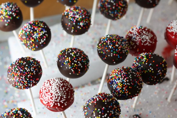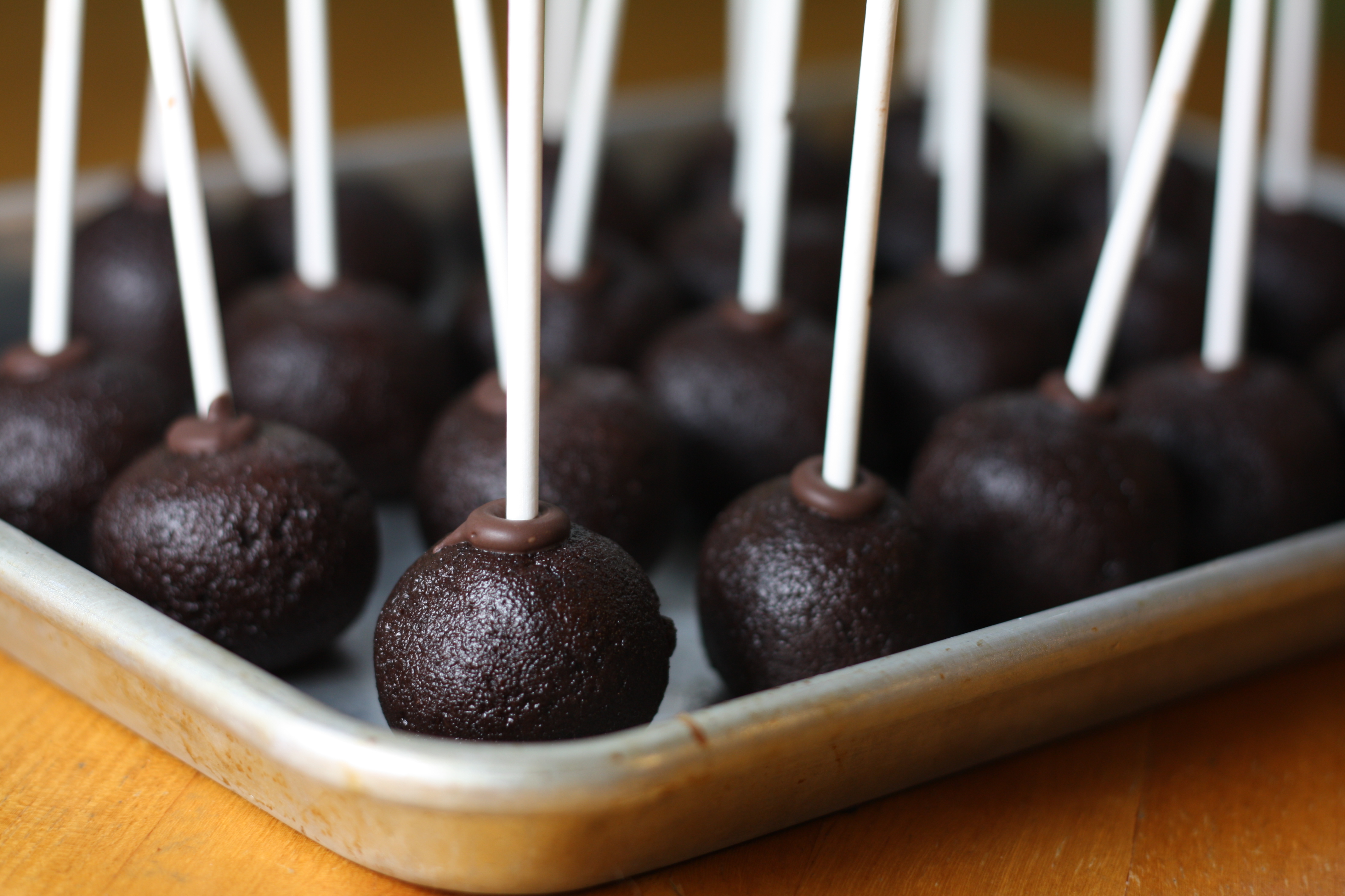 2. I tried these once. I had a few issues… “room temperature” in my heat-of-the day un-airconditioned house didn’t help anything. And I must have missed this step in my process: “Melt a small quantity of the candy melts….Dip the end of each lollipop stick into the melted candy, then insert the stick a little more than halfway through each cake ball….” My cake balls kept falling off the stick. After reading your instructions I think I’d like to try it again. I also like the idea of making the cake one day and fixing it up the next. Too much time in the kitchen in one day doesn’t make me a happy person.
