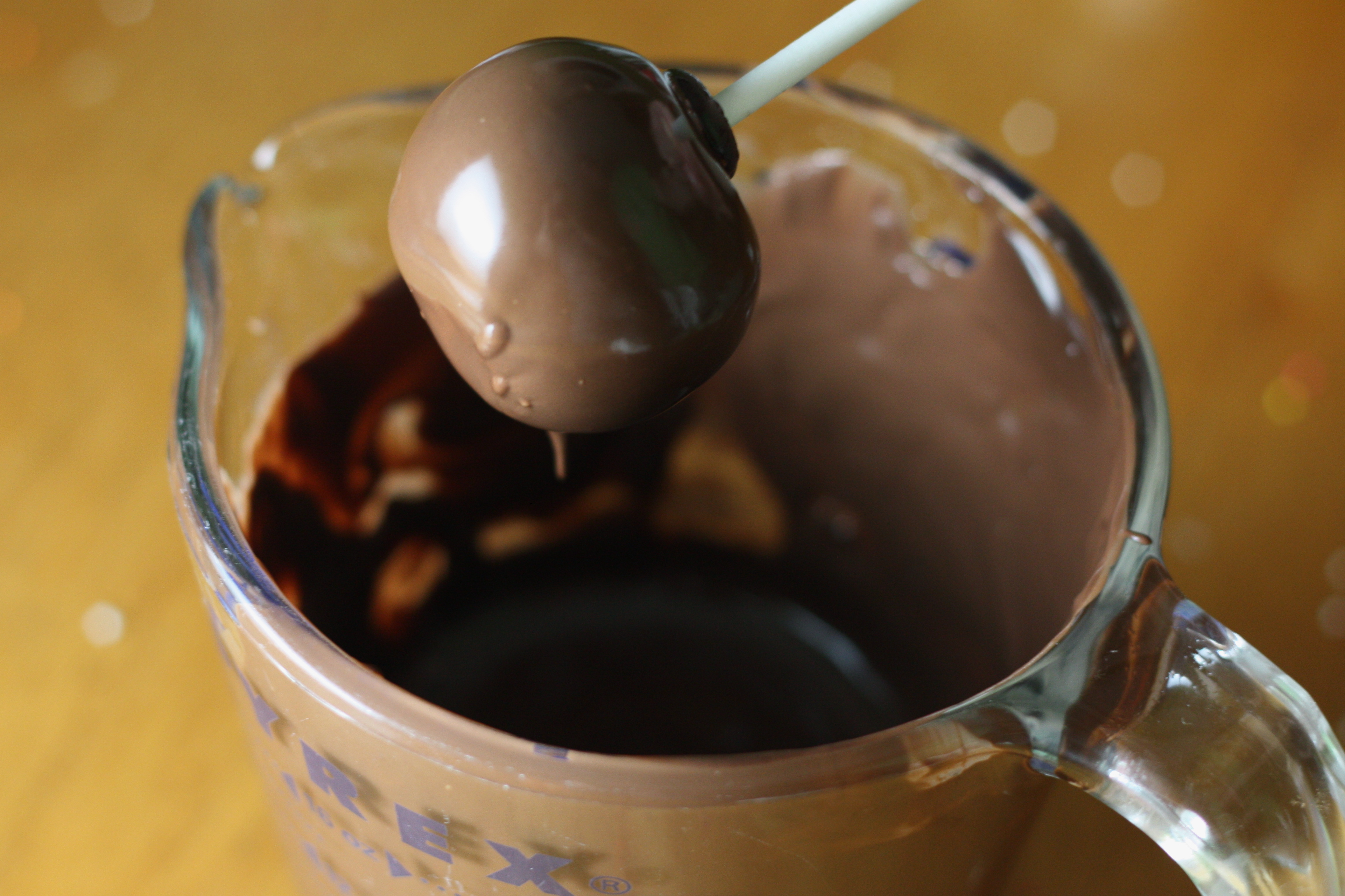 Once firm, warm the candy melts according to package directions. Use a container that is tall and narrow enough to fully submerge each cake pop into. A 2-cup pyrex measuring cup worked well.